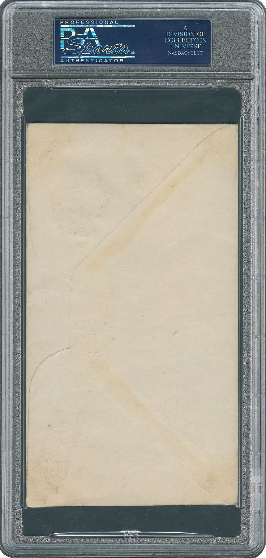 First day cover honoring the centennial of baseball, postmarked at Cooperstown on June 12, 1939, signed in fountain pen, "Tris Speaker." In fine condition. Accompanied by a full letter of authenticity from JSA. This three-cent postage stamp honoring baseball's 100th anniversary was issued in conjunction with the dedication and opening of the National Baseball Hall of Fame in Cooperstown, New York, on June 12, 1939. One of the best center fielders in history, Speaker was elected to the Hall as a member of its second class in 1937, and was honored at the first induction ceremonies in 1939. Encapsulated in a PSA/DNA authentication holder.