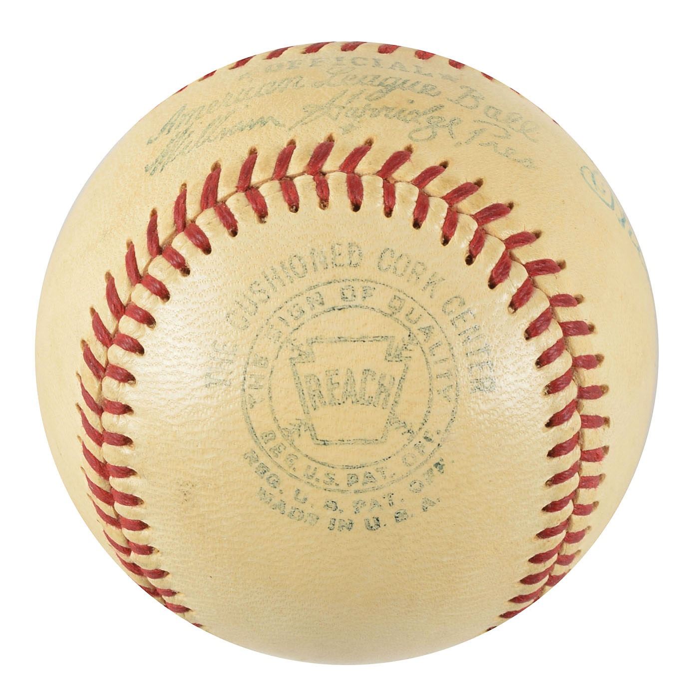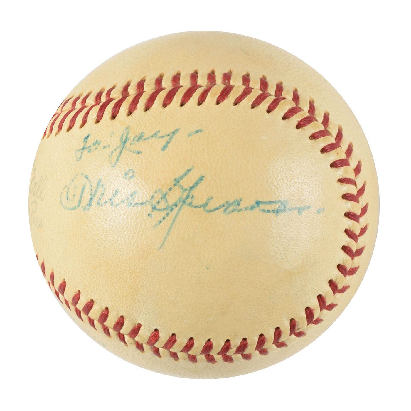 Official Reach American League (Harridge) baseball signed and inscribed in blue ballpoint on a side panel, "To Jay, Tris Speaker." In fine condition. A superior, clean example of a single-signed Speaker baseball. Accompanied by a full letter of authenticity from PSA/DNA.