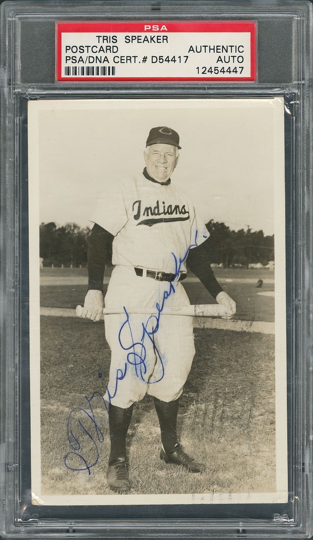 Vintage glossy 3.5 x 5.5 postcard photo of Tris Speaker in uniform as manager of the Cleveland Indians, signed in blue ink. In very good to fine condition, with light brushing to the signature, and a postal cancellation to the right side. Encapsulated in a PSA/DNA authentication holder.