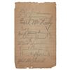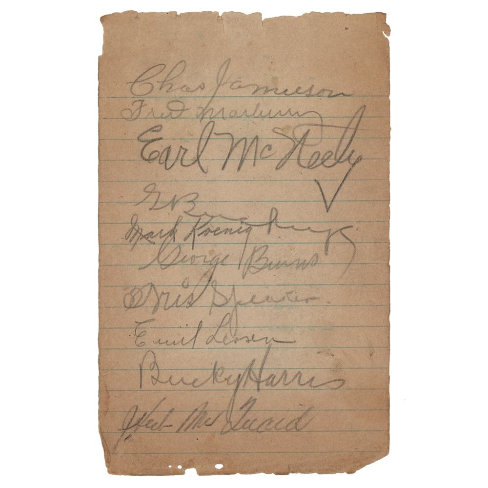 Pencil signatures of Tris Speaker, Herb Pennock, Bucky Harris, and eight other early baseball players on an off-white 3.5 x 5.5 sheet of notebook paper. Other signers include Mark Koenig, Charlie Jamieson, Firpo Marberry, Earl McNeely, George Burns, and more. In very good to fine condition, with light toning and edge chipping.