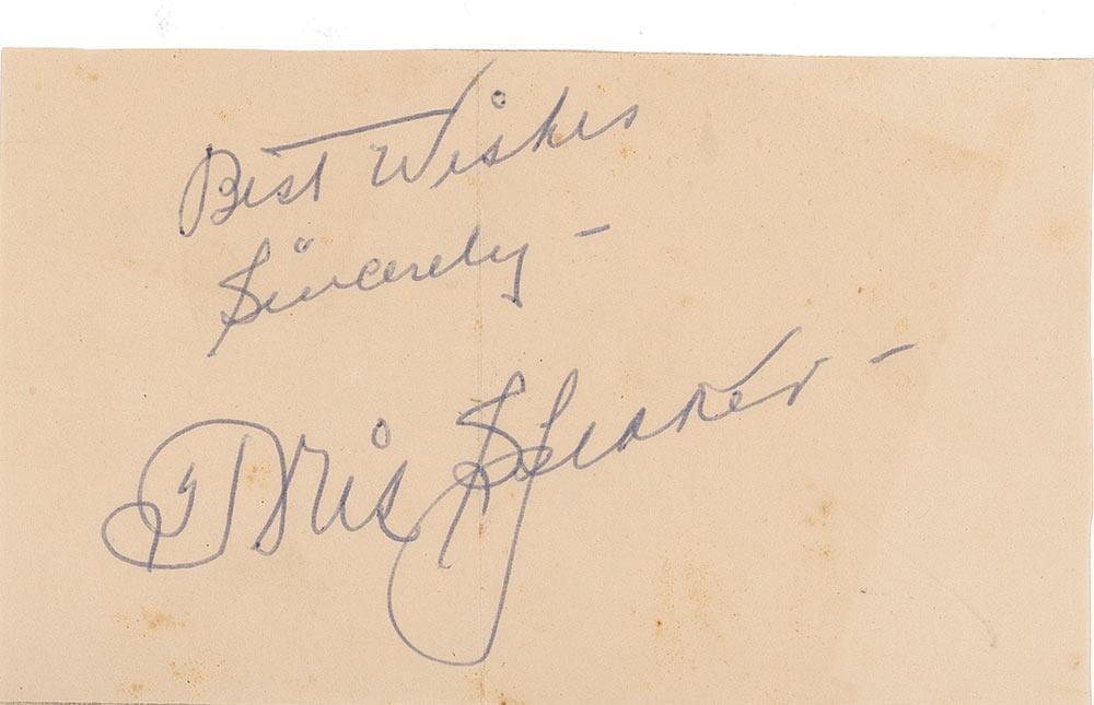 Vintage fountain pen signature, “Best Wishes, Sincerely—Tris Speaker,” on an off-white 5 x 3 slip. In very good condition, with creases, vertical fold passing through the first letter of his last name and greeting, and uniform toning.