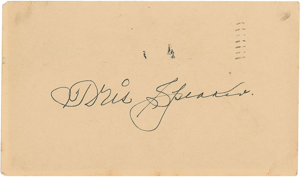 Vintage fountain pen signature, “Tris Speaker,” on an off-white 5.5 x 3.25 government postcard (postmarked 8/30/1949). In fine condition, with a couple corner dings and creases, and mild scattered soiling. Accompanied by an unsigned satin-finish 8 x 10 photo of the Hall of Fame center fielder.