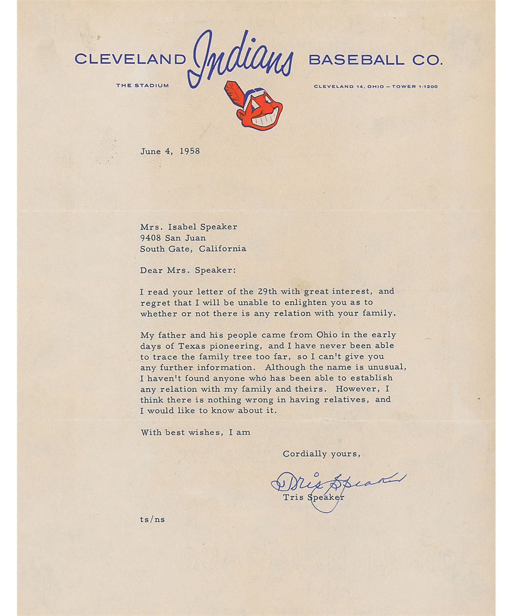 TLS, one page, 8.5 x 10.75, Cleveland Indians letterhead, June 4, 1958. Letter to Isabel Speaker of California. In part: “I will be unable to enlighten you as to whether or not there is any relation with your family. My father and his people came from Ohio in the early days of Texas pioneering, and I have never been able to trace the family tree too far, so I can’t give you any further information. Although the name is unusual, I haven’t found anyone who has been able to establish any relation with my family and theirs. However, I think there is nothing wrong in having relatives, and would like to know about it.” Affixed to a same-size scrapbook page. In fine condition, with a paperclip impression to the upper left corner and a couple small areas of subtle foxing.