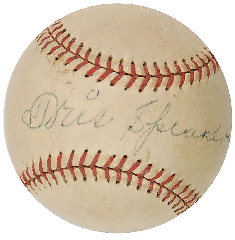 Official Harwood Official League baseball signed in blue ink on the sweet spot, “Tris Speaker.” In very good condition, with mild overall toning and soiling, and indications of signature removals to give the appearance of a single-signed baseball; the maker stamps and signature are quite bold and the baseball presents beautifully. Accompanied by a full letter of authenticity from PSA/DNA. An especially appealing example of this difficult-to-find format.
