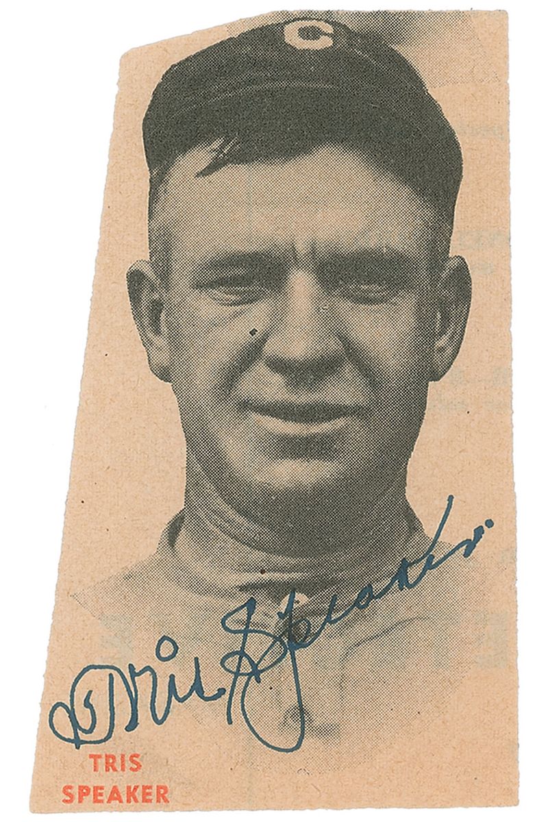 Seventh player elected to the Baseball Hall of Fame (1888–1958) and the greatest center fielder of his day. Vintage 2 x 3.5 magazine photo, boldly signed in fountain pen. In fine condition, with irregular edges.