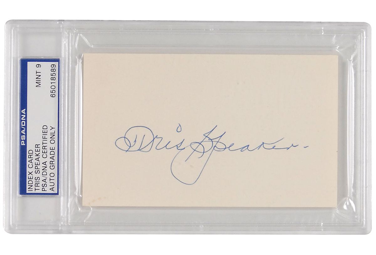 Choice ballpoint signature, “Tris Speaker,” on an off-white 5 x 3 card. Encapsulated in a plastic PSA/DNA authentication holder, grading the autograph “Mint 9.” In fine condition.