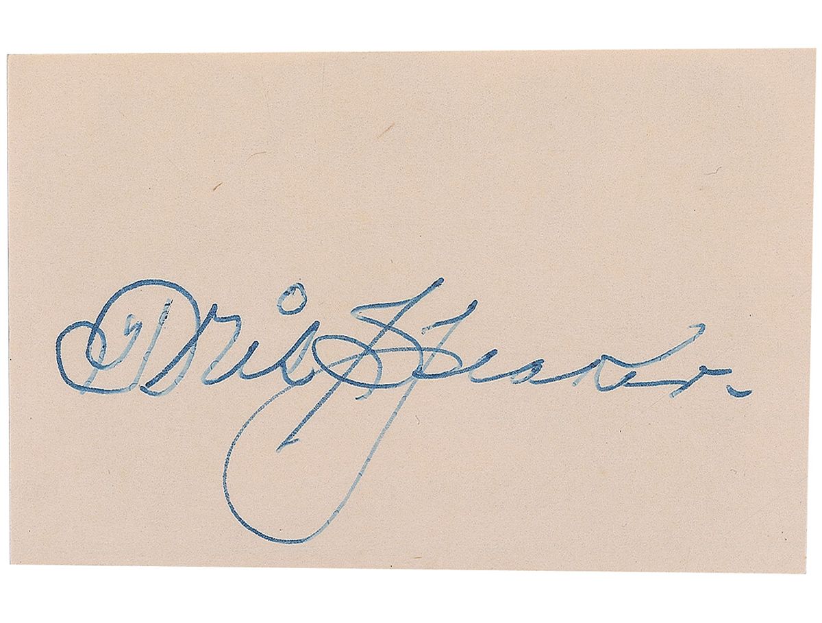 Crisp ballpoint signature, “Tris Speaker,” on an off-white 3 x 2 card. In fine condition. Accompanied by a pair of modern glossy photos.