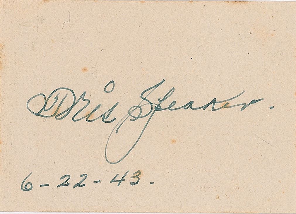 Vintage fountain pen signature, "Tris Speaker, 6-22-43,” on an off-white 3.5 x 2.5 card. In fine condition, with some scattered tiny stains.