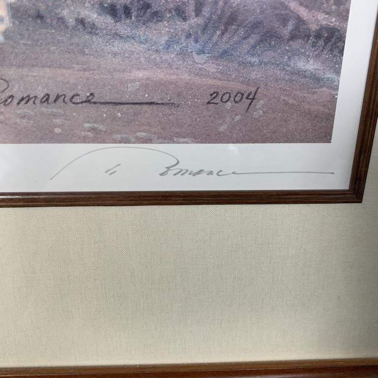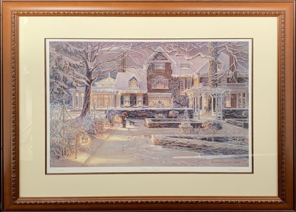 Trisha Romance's "All is Calm" limited edition print, signed lower right and numbered 3167/10000 lower left. This piece is of a young girl hanging lights outside her home in the middle of the winter. This print has been professionally matted with an inner fillet, and has been custom framed under glass. Included with a certificate of authenticity.
