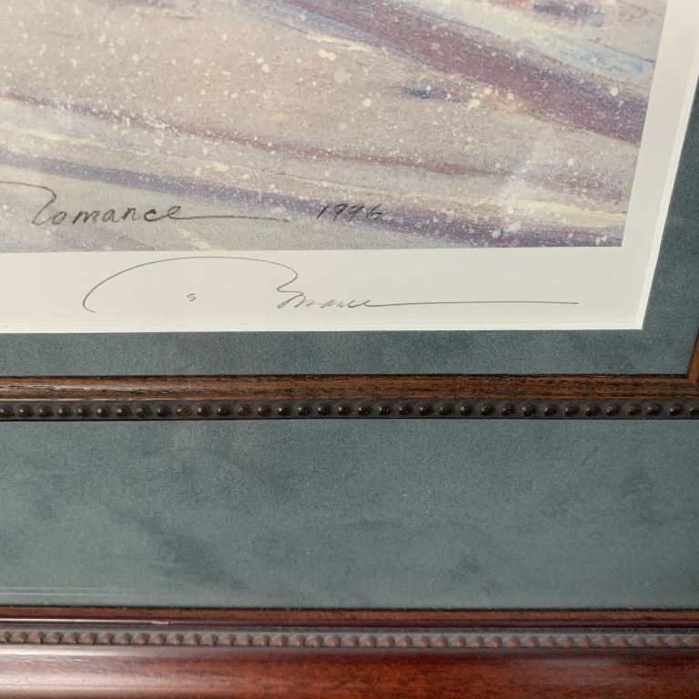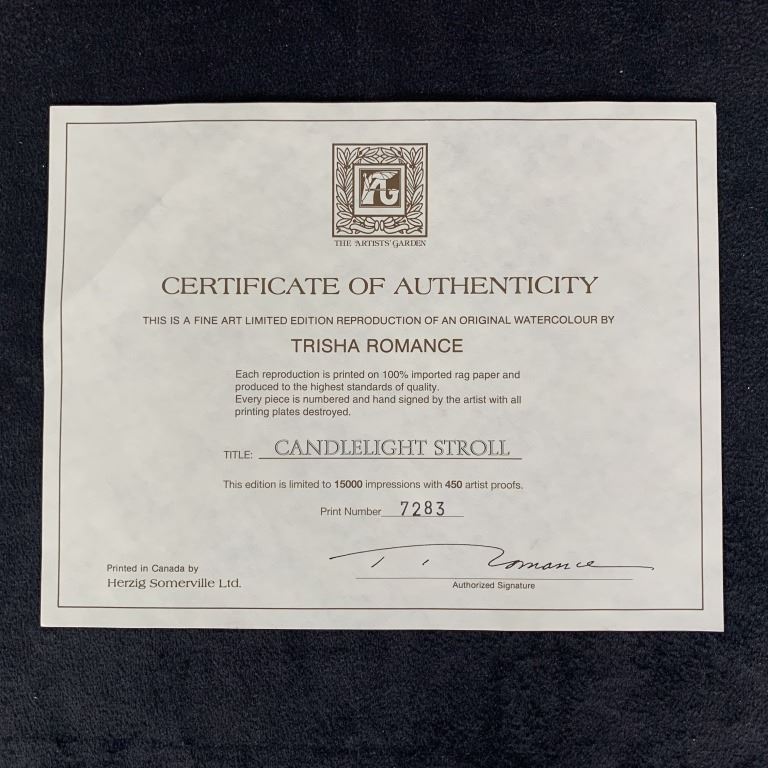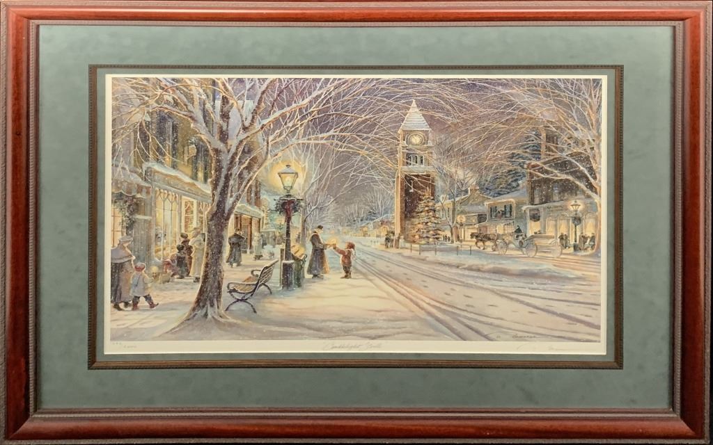 Trisha Romance's "Candlelight Stroll" limited edition print, signed lower right and numbered 7283/15000 lower left. This piece is of an older man helping a young child light their candle, in the evening, in the middle of a street in winter. This print has been professionally double matted with suede acid free matting and an inner fillet, and has been custom framed under glass. Included with a certificate of authenticity.