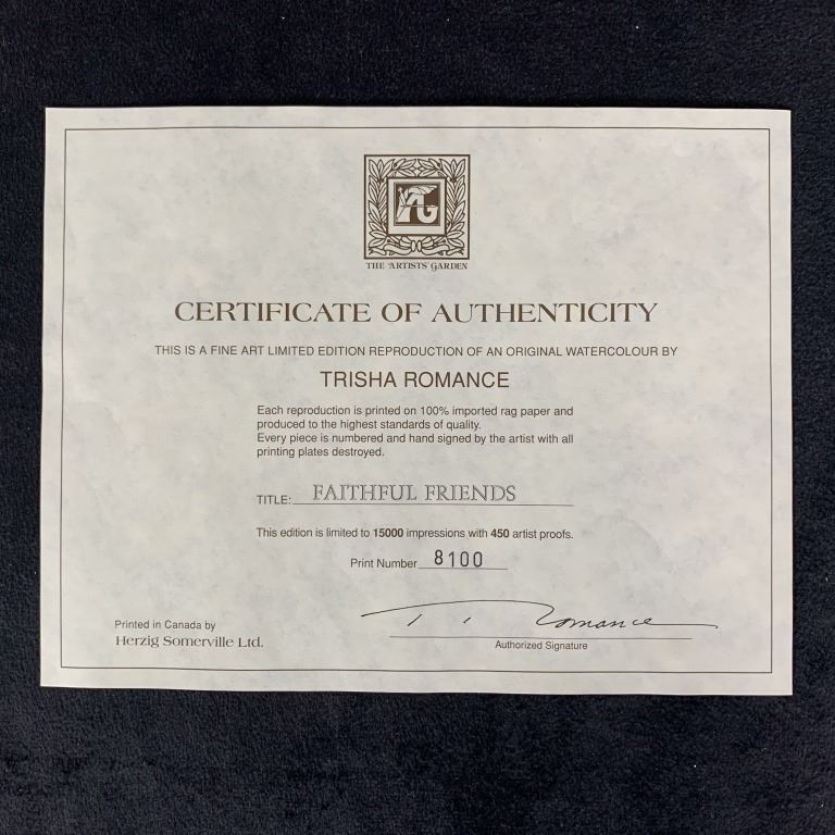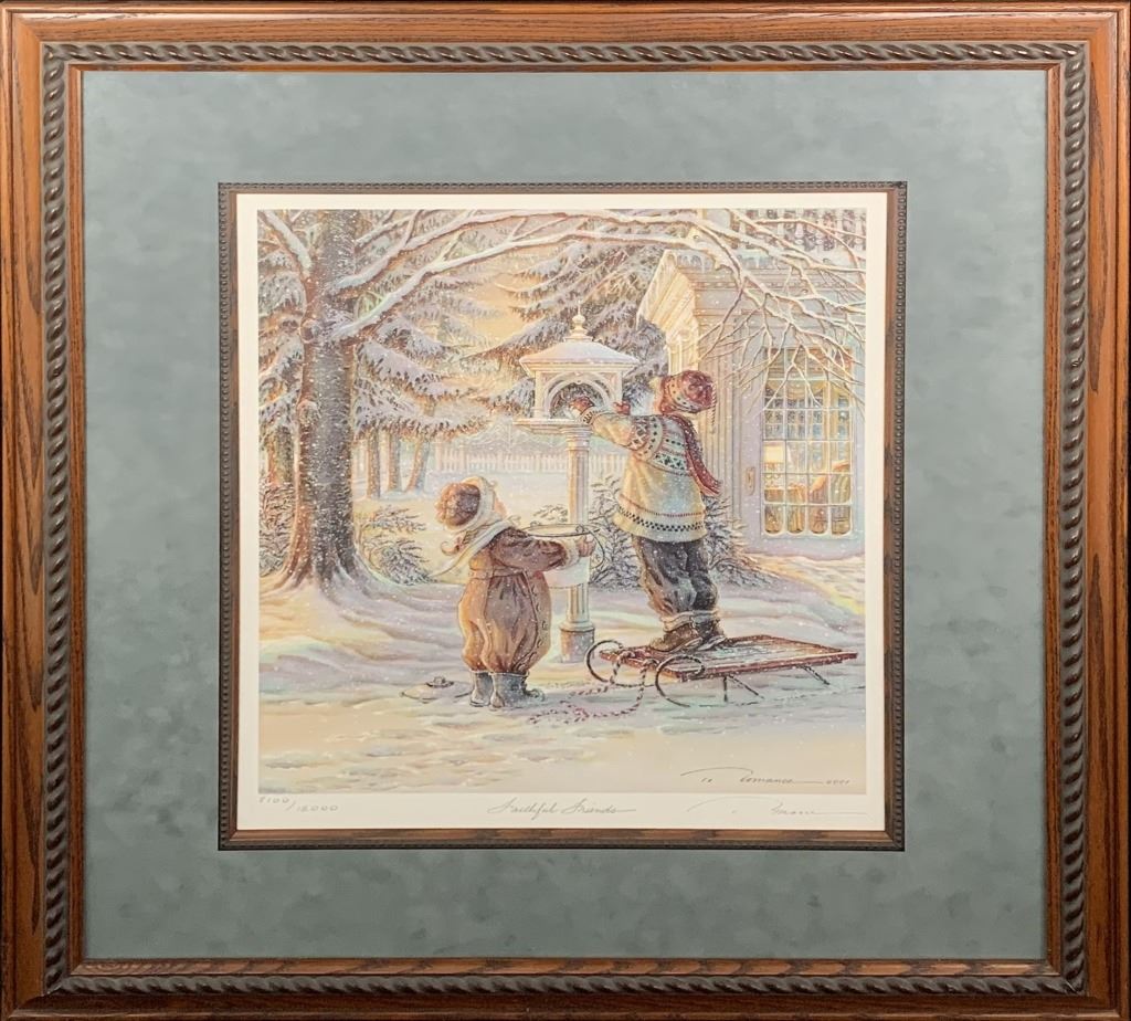 Trisha Romance's "Faithful Friend" limited edition print, signed lower right, and numbered 8100/15000 lower left. This piece is of two children filling a bird feader in the winter. This print has been professionally matted with suede acid free matting and an inner fillet, and has been custom framed under glass. Included with a certificate of authenticity.
