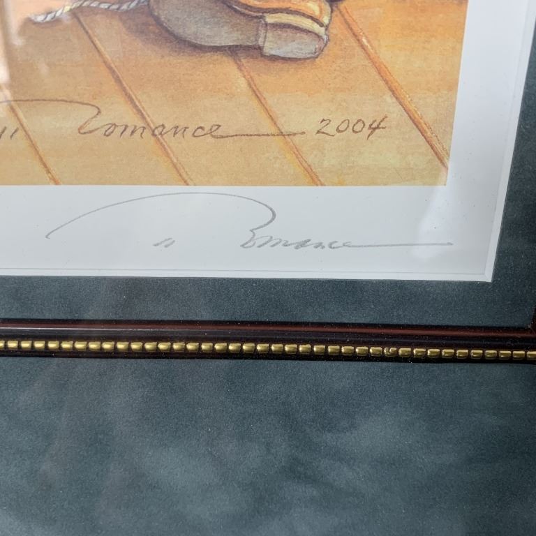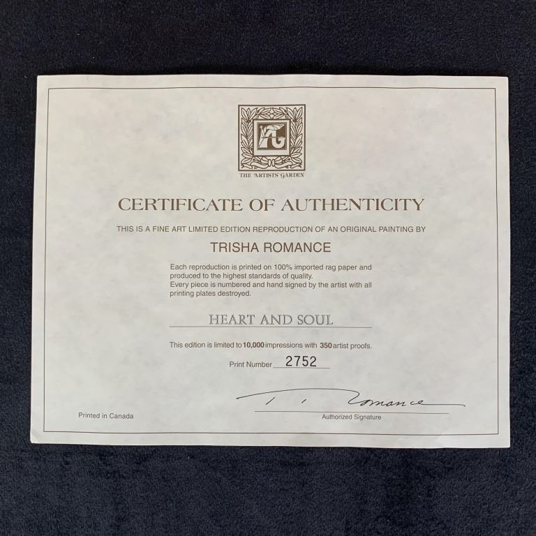Trisha Romance's "Heart and Soul" limited edition print, signed lower right and numered 2752/10000 lower left. This piece is of a mother and her son painting together. This print has been professionally double matted with suede acid free matting and an inner fillet, and has been custom framed under glass. Included with a certificate of authenticity.