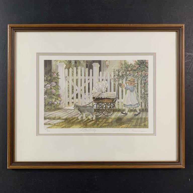 Trisha Romance's "Little Family" limited edition print, signed lower right, titled lower middle, and numbered 837/950 lower left. This piece is of a young girl pushing an old baby stroller, with her small dog attached to the stroller. This piece has been professionally triple matted with acid free matting, and has been custom framed under glass. Included with a certificate of authenticity.