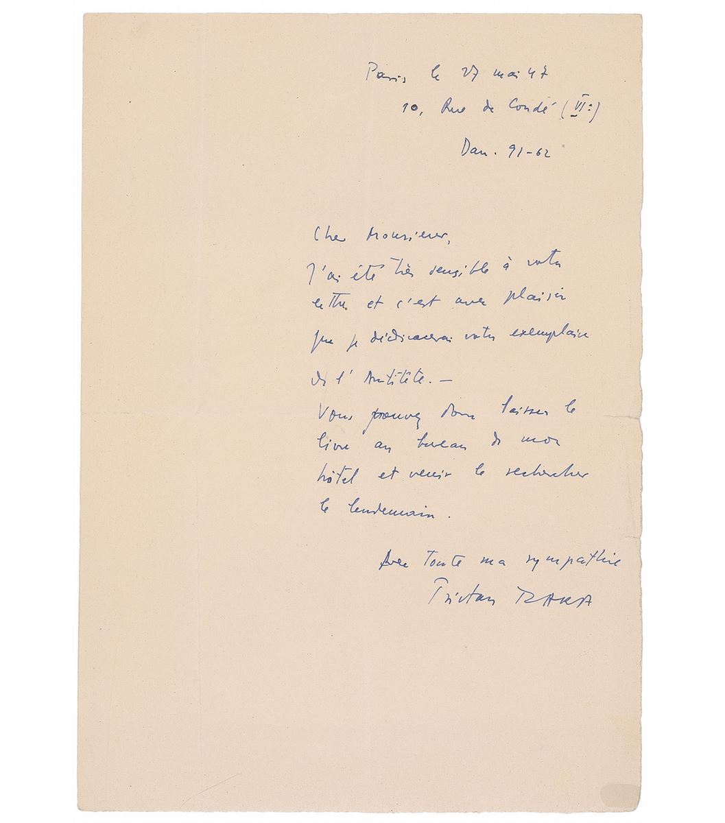 Romanian and French avant-garde poet, essayist and performance artist (1896–1963). ALS in French, one page, 5.75 x 8.25, May 27, 1947. Letter to an unidentified recipient in which he agrees to autograph a copy of his famous book L’Antitete and offers "to leave the book in the office of my hotel and go look for it the next day." In fine condition, with intersecting folds (a partial separation to right edge), trivial creasing, and two small edge tears.
