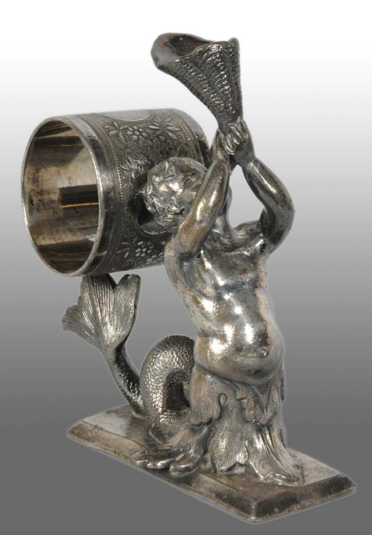Marked "Rogers & Bro" and not numbered. Also known as Child of the Sea depicting half human, half fish blowing a conch shell balancing napkin holder between head and tail on rectangular base. Some silver loss. Condition (Good).