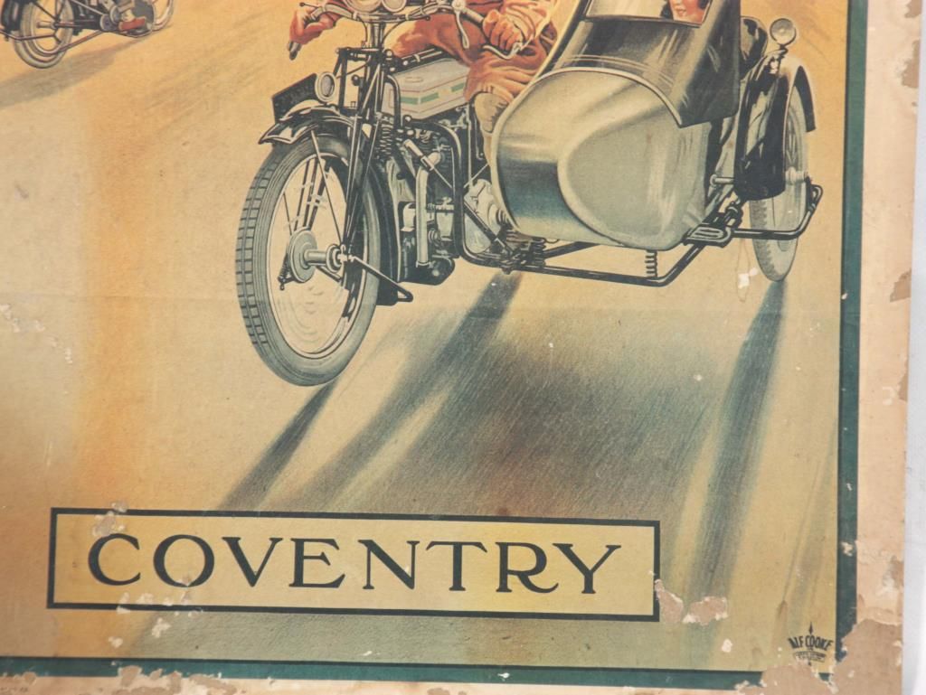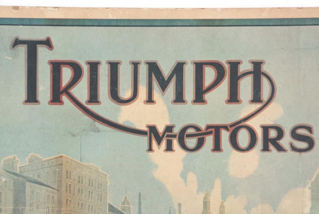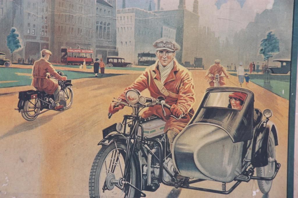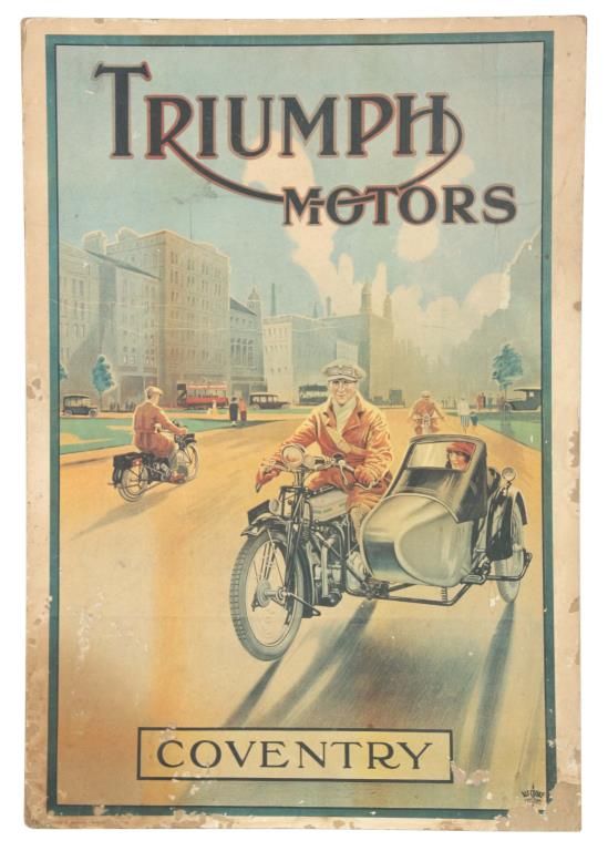 Triumph Motors Advertising Poster. Image of a man riding a motorcycle with a woman riding in the attached sidecar, tall buildings in the background, reads Triumph Motors – Coventry (England). Printed by Alf Cooke Ltd. Mounted on cardboard, has some losses. 26 in. high x 18 in. wide.
