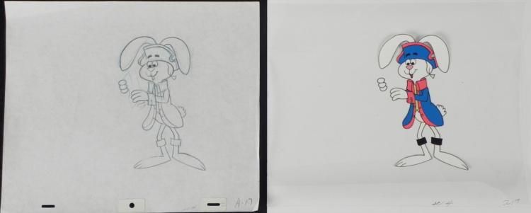 In this cel/drawing, the Trix rabbit finally has the cereal box in his hands. This original animation cel & drawing are from the production of the Trix cereal commercial. * * * Original Animation Cel & DrawingMedium: Hand painted acetate celDetails: Animation notations and peg holes * * Original "rough" animation drawing, in non-photo blue and black pencil * * Size of cel: 10 1/2 x 12 1/2 inchesSize of drawing: 10 1/2 x 12 1/2 inches * * Condition: Very good * This is an original hand-painted cel set-up used in the production of the "Trix Cereal Commercial." Each one-of-a-kind set-up represents a slight change in position of the characters. When individually photographed and projected in rapid succession, the images * appear to move. To created production cels, the original animator's drawing is transferred onto an acetate cel (by hand-inking and/or photo copying). The cel is then hand-painted on the reverse side. * * * * The cel and drawing received may be ever so slightly different than the one shown in the auction photo. * * * * Traditional animation is a multi-step process which includes various types of art techniques. Drawings are a key part of the process, in which the animator creates the design and movement of the characters. Drawings are then transferred onto acetate cels.