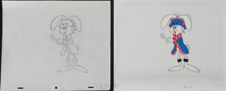 In this cel/drawing, the Trix rabbit finally has the cereal box in his hands. This original animation cel & drawing are from the production of the Trix cereal commercial. Original Animation Cel & DrawingMedium: Hand painted acetate celDetails: Animation notations and peg holes Original "rough" animation drawing, in non-photo blue and black pencil Size of cel: 10 1/2 x 12 1/2 inchesSize of drawing: 10 1/2 x 12 1/2 inches Condition: Very good This is an original hand-painted cel set-up used in the production of the "Trix Cereal Commercial." Each one-of-a-kind set-up represents a slight change in position of the characters. When individually photographed and projected in rapid succession, the images appear to move. To created production cels, the original animator's drawing is transferred onto an acetate cel (by hand-inking and/or photo copying). The cel is then hand-painted on the reverse side. The cel and drawing received may be ever so slightly different than the one shown in the auction photo. Traditional animation is a multi-step process which includes various types of art techniques. Drawings are a key part of the process, in which the animator creates the design and movement of the characters. Drawings are then transferred onto acetate cels.