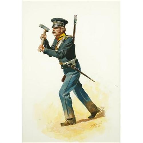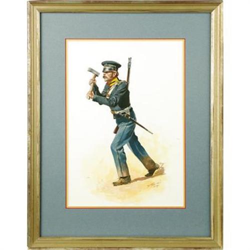 <B>Don Troiani: </B></I><B><I>Sapper Private, U.S. Corps of Engineers, 1847.</B></I></B></I><BR> Gouache on paper, 10" x 14.75" within matted frame.<BR>Prior to the outbreak of the Mexican War, there had been no enlisted troops in the Corps of Engineers since 1820. However, on 15 May 1846, Congress added a "Company of Sappers, Miners and Bombardiers" to the Corps, consisting of 10 sergeants, 10 corporals two musicians, and 72 privates, commanded by a captain and two lieutenants of engineers (one of which was George B. McClellan, who would later command the Army of the Potomac during the Civil War). Joining Winfield Scott's army in time for the siege of Vera Cruz, they were soon dubbed the "pick and shovel brigade" by infantrymen. The joke was soon reversed, as the engineers were responsible for supervising infantry troops detailed to provide the "muscle" labor of siege warfare. The engineer company was finally able to prove their fighting abilities during the Battle of Cerro Gordo, when they joined Colonel Harney's assault on the main Mexican works. From that point on, the company was placed in the vanguard of the army's advance and fought at Contreras and Churubusco. Its crowning achievement in combat would occur during the capture of Mexico City. During the September 15, 1847 assault on heavily-fortified San Cosme Gateway, the engineer troops, supported by some infantry, "broke through the walls from house to house" with picks, crowbars and axes until they reached the rooftop command of the Mexican battery, which they then enfiladed with a heavy fire, helping bring about the retreat of the enemy. Unlike the majority of foot soldiers in the U.S. Army, who were clothed in sky blue jackets and trousers and carried flintlock muskets, the elite Company of Sappers, Miners and Pontoniers were clothed in a uniform consisting of a dark blue jacket, with black velvet collar and yellow and red trim and sky blue trousers with black edging and armed with the new Model 1842 percussion musket. Their forage caps bore the brass castle device of the Corps of Engineers. Don Troiani, acclaimed as the best living American artist specializing in historical subjects, has depicted a private of this famous unit as he might have appeared during the taking of San Cosme Gateway. <BR><BR><b>Shipping:</b> Framed - with Glass, Small (<a target="_blank" href="http://www.heritageauctions.com/common/shipping.php">view shipping information</a>)