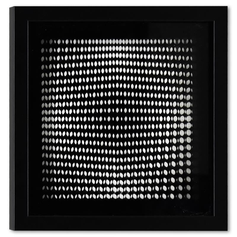 "Trois Dimensions Optique de la série Cinetiques" is a dimensional artwork, published in 1973, by Victor Vasarely (1908-1997). This piece comes custom framed. This piece comes with a catalogue raisonne of Vasarely's work with forward from Marcel Joray (paper back, published 1976). Includes Letter of Authenticity. Measures approx. 11.5" x 11.5" (frame), 9" x 9" (image).