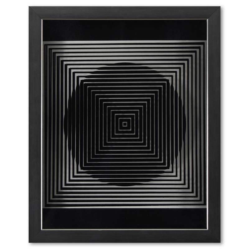 "Trois Dimensions Optique de la série Cinetiques" is a dimensional artwork, published in 1973, by Victor Vasarely (1908-1997). This piece comes custom framed, with a letter of authenticity and with a 1976 Vasarely paperback. Measures approx. 10.5" x 13" (frame), 8.5" x 11" (image).
