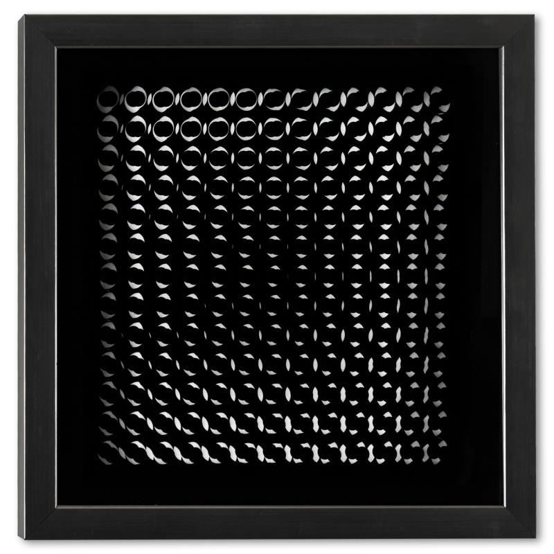 "Trois Dimensions Optique de la série Cinetiques" is a dimensional artwork, published in 1973, by Victor Vasarely (1908-1997). This piece comes custom framed, with a letter of authenticity and with a 1976 Vasarely paperback. Measures approx. 11.5" x 11.5" (frame), 9" x 9" (image).