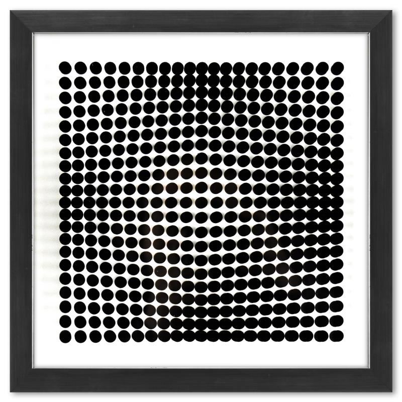 "Trois Dimensions Optique de la série Cinetiques" is a dimensional artwork, published in 1973, by Victor Vasarely (1908-1997). This piece comes custom framed, with a letter of authenticity and with a 1976 Vasarely paperback. Measures approx. 11.5" x 11.5" (frame), 9" x 9" (image).
