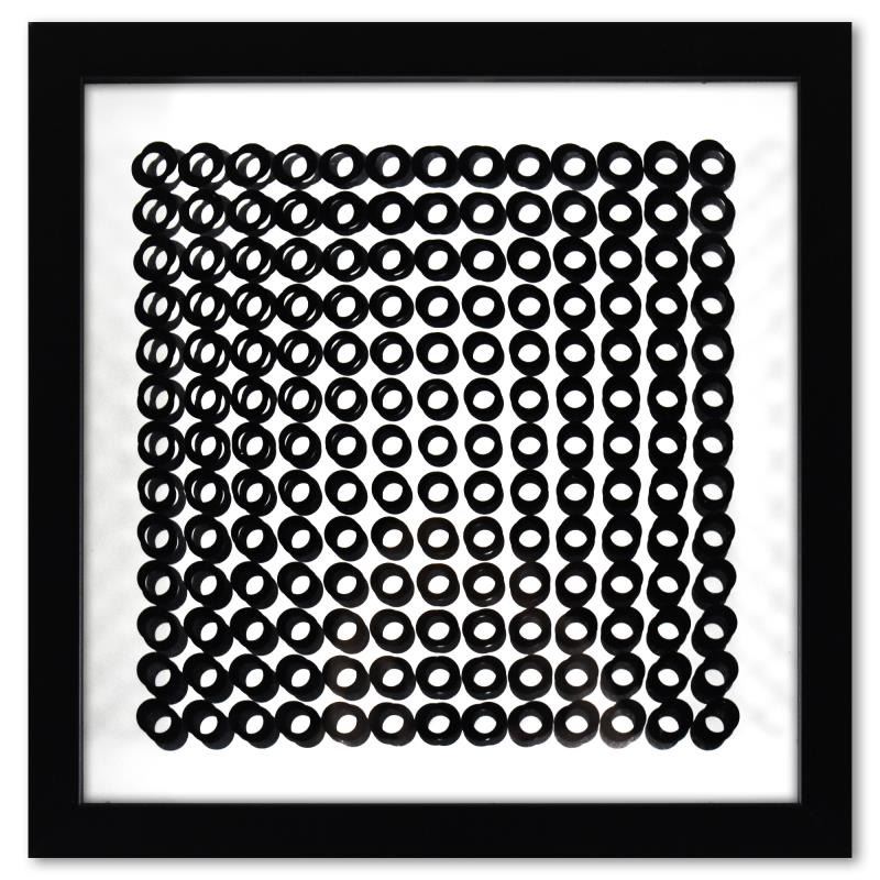 "Trois Dimensions Optique de la série Cinetiques" is a dimensional artwork, published in 1973, by Victor Vasarely (1908-1997). This piece comes custom framed. This piece comes with a catalogue raisonne of Vasarely's work with forward from Marcel Joray (paper back, published 1976). Includes Letter of Authenticity. Measures approx. 11.5" x 11.5" (frame), 9" x 9" (image).