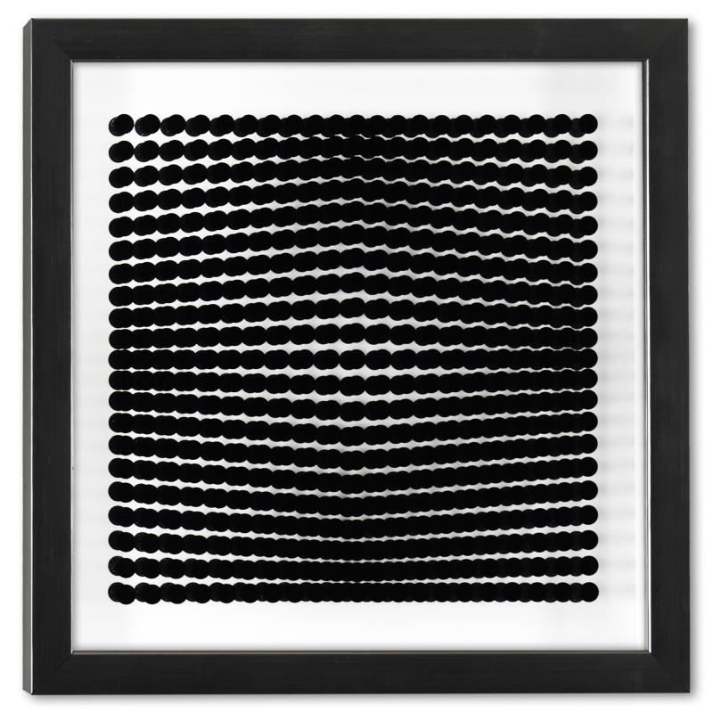 "Trois Dimensions Optique de la serie Cinetiques" is a dimensional artwork published in 1973 by Victor Vasarely (1908-1997). This piece comes custom framed with a letter of authenticity and with a 1976 Vasarely paperback. Measures approx. 11.5" x 11.5" (frame) 9" x 9" (image).
