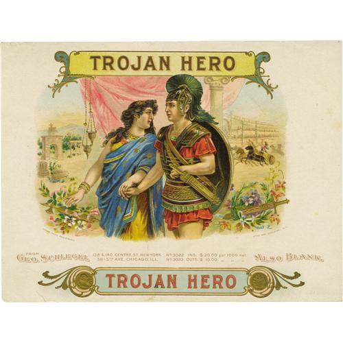 <B><I>Trojan Hero</B></I></B></I><B> Sample Cigar Label by George Schlegel, New York.</B></I> Full color lithographed 8" x 6" inner label. A slightly effeminate Hector or Aeneas strolls here with an adoring and decidedly feminine admirer. In the carefree spirit of historical inaccuracy, smaller vignettes depict an Imperial Roman arch and a Byzantine chariot race. Slight wear to corners, else excellent condition.<BR><BR><b>Shipping:</b> Small Flat (<a target="_blank" href="http://www.heritageauctions.com/common/shipping.php">view shipping information</a>)