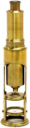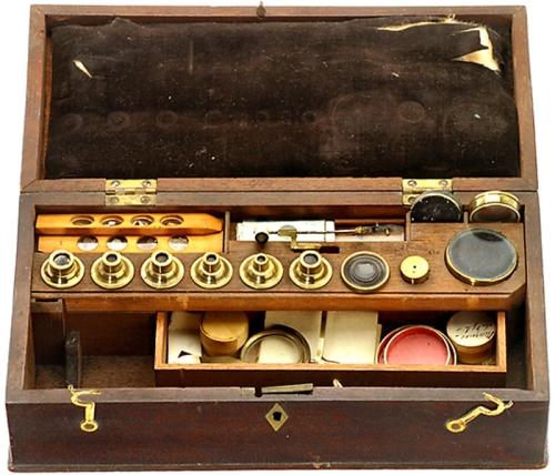 Trommel-Mikroskop, um 1860 Vermutlich englisch, unbezeichnet, Messing, Höhe ca. 26 cm. Mit umfangreichem Zubehör (allein 6 Objektive) und 6 sehr schönen Präparatstreifen in Original-Holzkasten. Drum Microscope Probably English, unmarked, brass, height approx. 10 1/2 in. With numerous accessories (6 lenses!) and 6 very nice preparations, in original wooden box. – (3/3) – € 200/300 – (352/8)