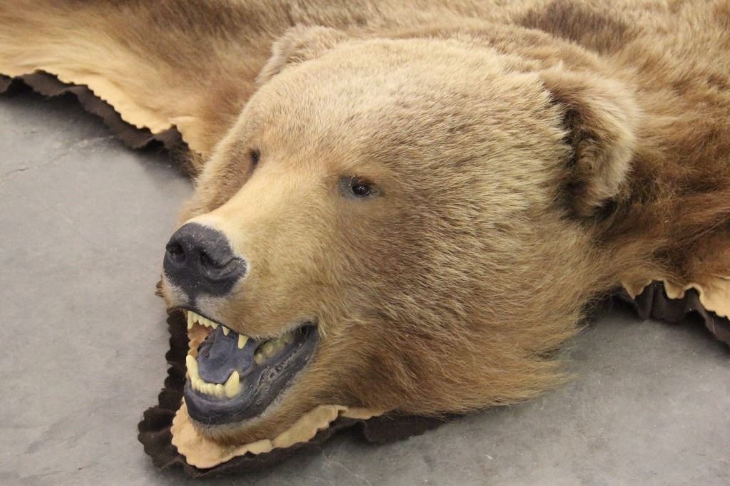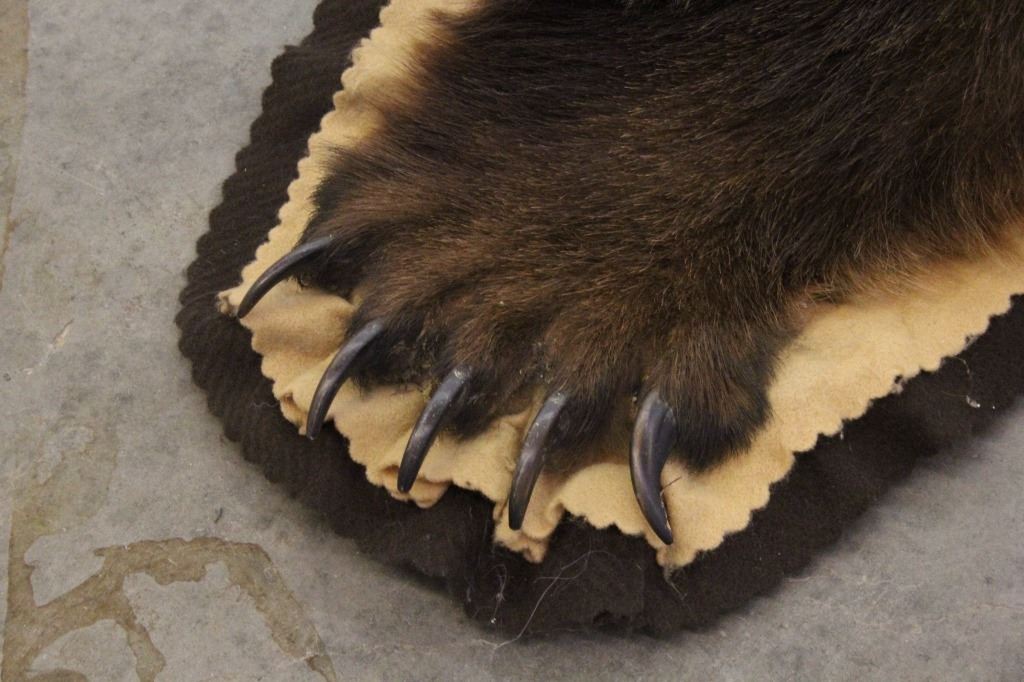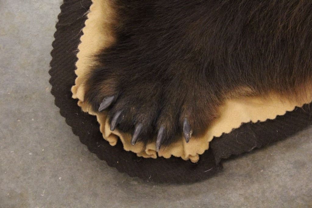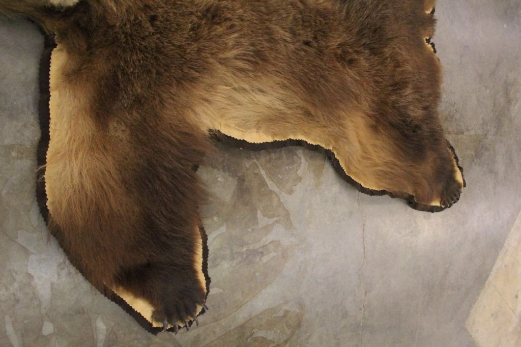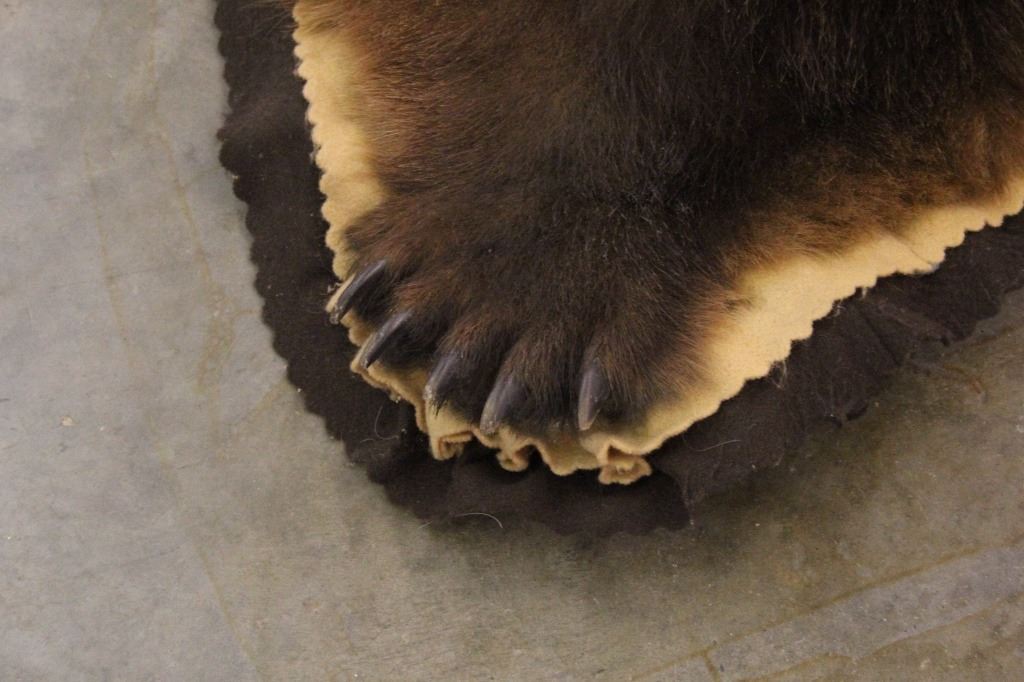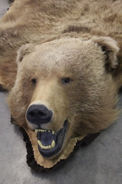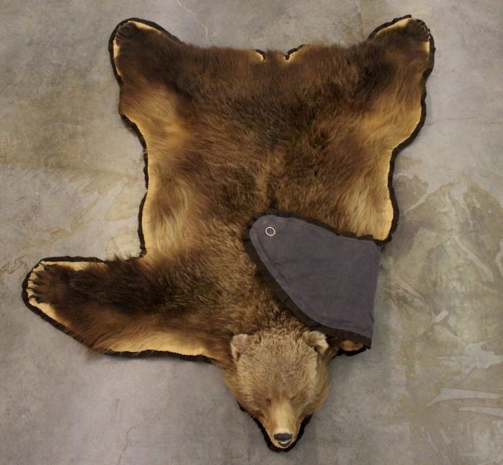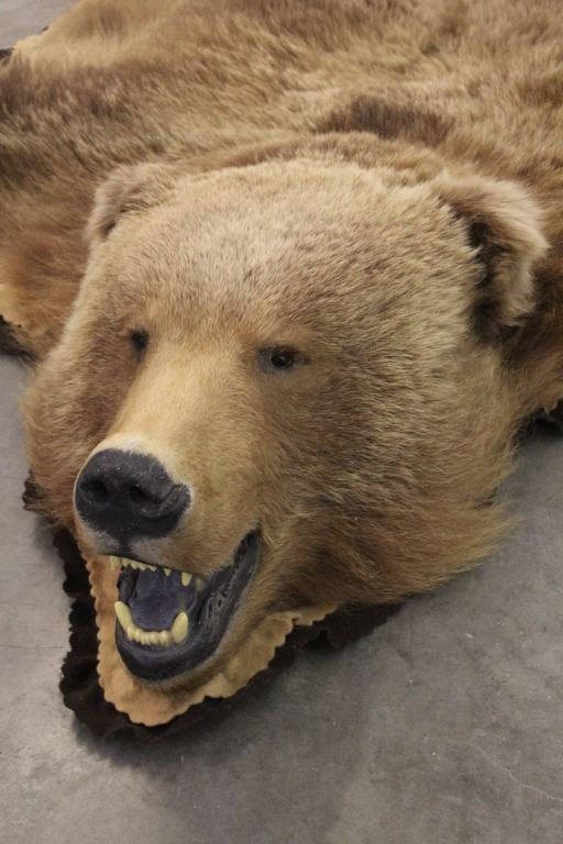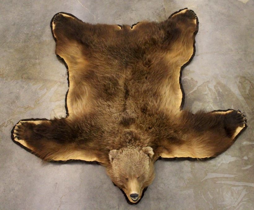 This is an exceptionally large trophy Kodiak Grizzly Brown Bear from Kodiak Island in Alaska. The trophy bear was shot by Lanny Vanmeter on the Russian River on Kodiak Island, Alaska in May of 2000. The impressive bear has been professionally prepared by a taxidermist and shows enormous size with large original claws. The fur shows a deep, rich brown color with silvery tones, and a thick coat. The rug shows all of the impressive large claws. The bear rug shows excellent condition and is considered to be a trophy size. The hide shows no visible damage and supple condition. Measures 102”W x 101”L. This comes with a notarized letter from the hunter stating when and where it was taken, along with the tag. This is legal to own and transfer. This is considered one of the largest and finest condition Kodiak Brown Bears offered for public sale and is truly and exceptional piece.