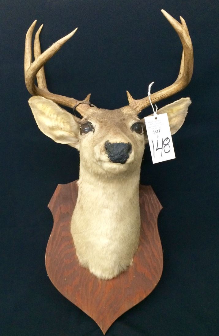 This 8 point Mule Deer head has been nicely mounted and is ready to hang with the attached wood plaque. Overall height of the piece is 27” tall and 13” wide. It would stick out about 15” from the wall.