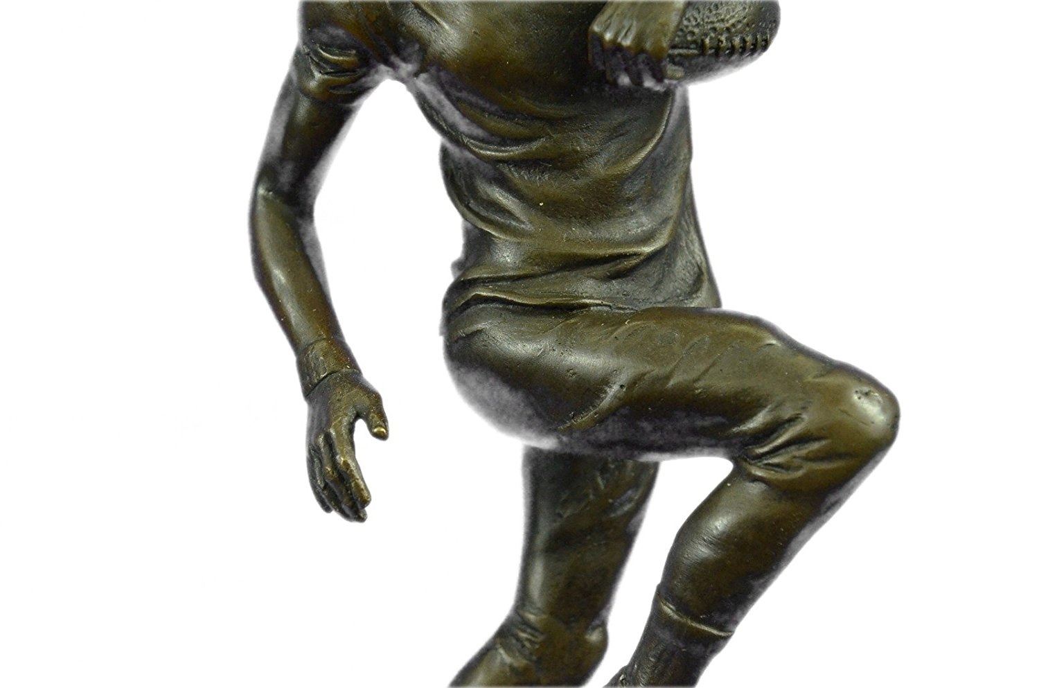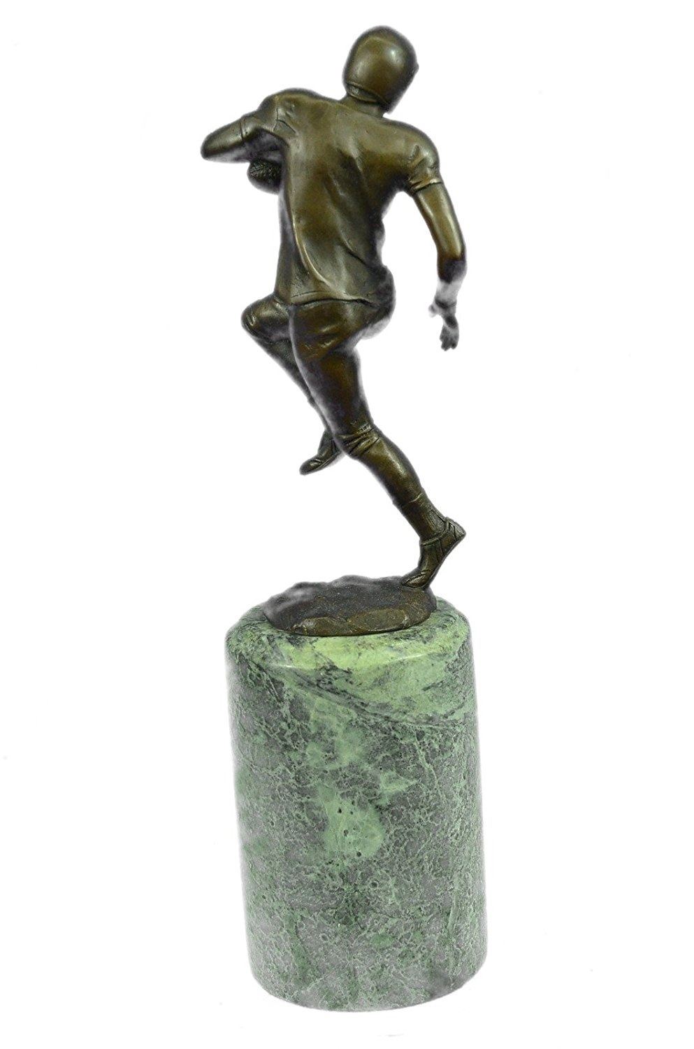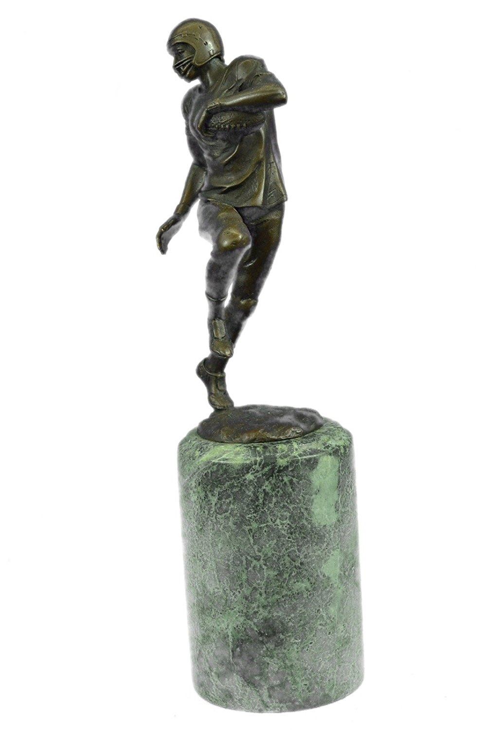 A muscular football player runs for the end field, trying to skip the yards and avoid being tackled. His powerful legs ache as he sprints and dodges. He tucks the ball under his arm protectively. Every once in a while he glances over his shoulder to see how close his opponents are. He eyes the white touch down line. 100% bronze and handmade, this brown patina sculpture was cast using the Lost Wax Method and mounted on a marble base. Bronze Dimensions with Marble Base: Height 12 X Width 4 inches. Marble Dimensions 4 inches. Weight: 7 LBS. Inventory: 68-B7122386