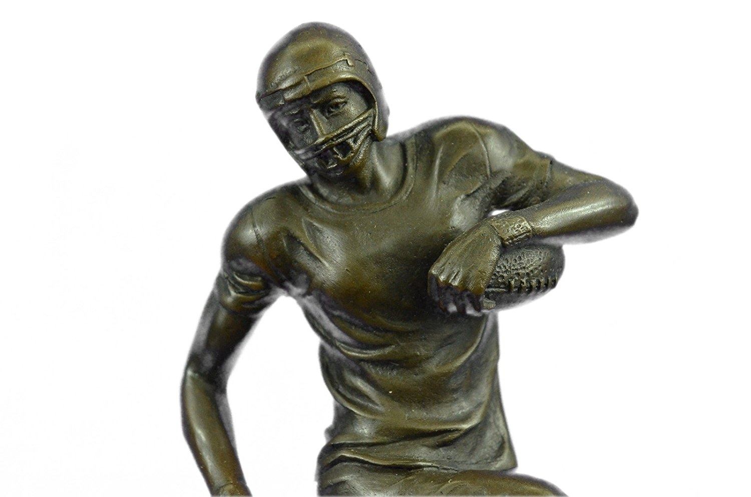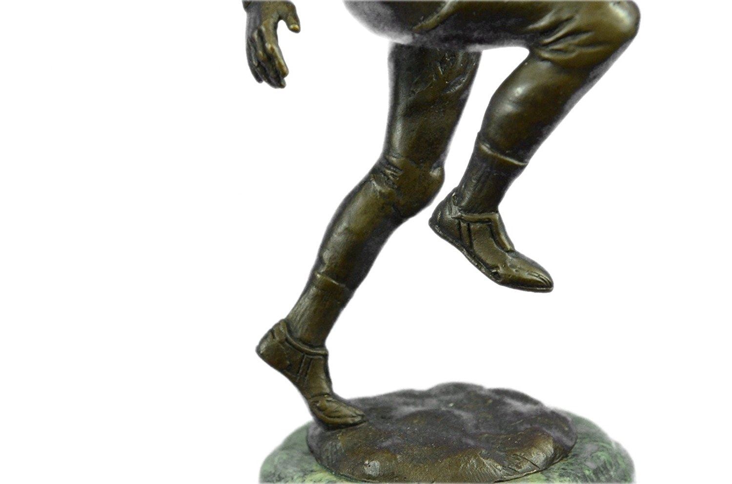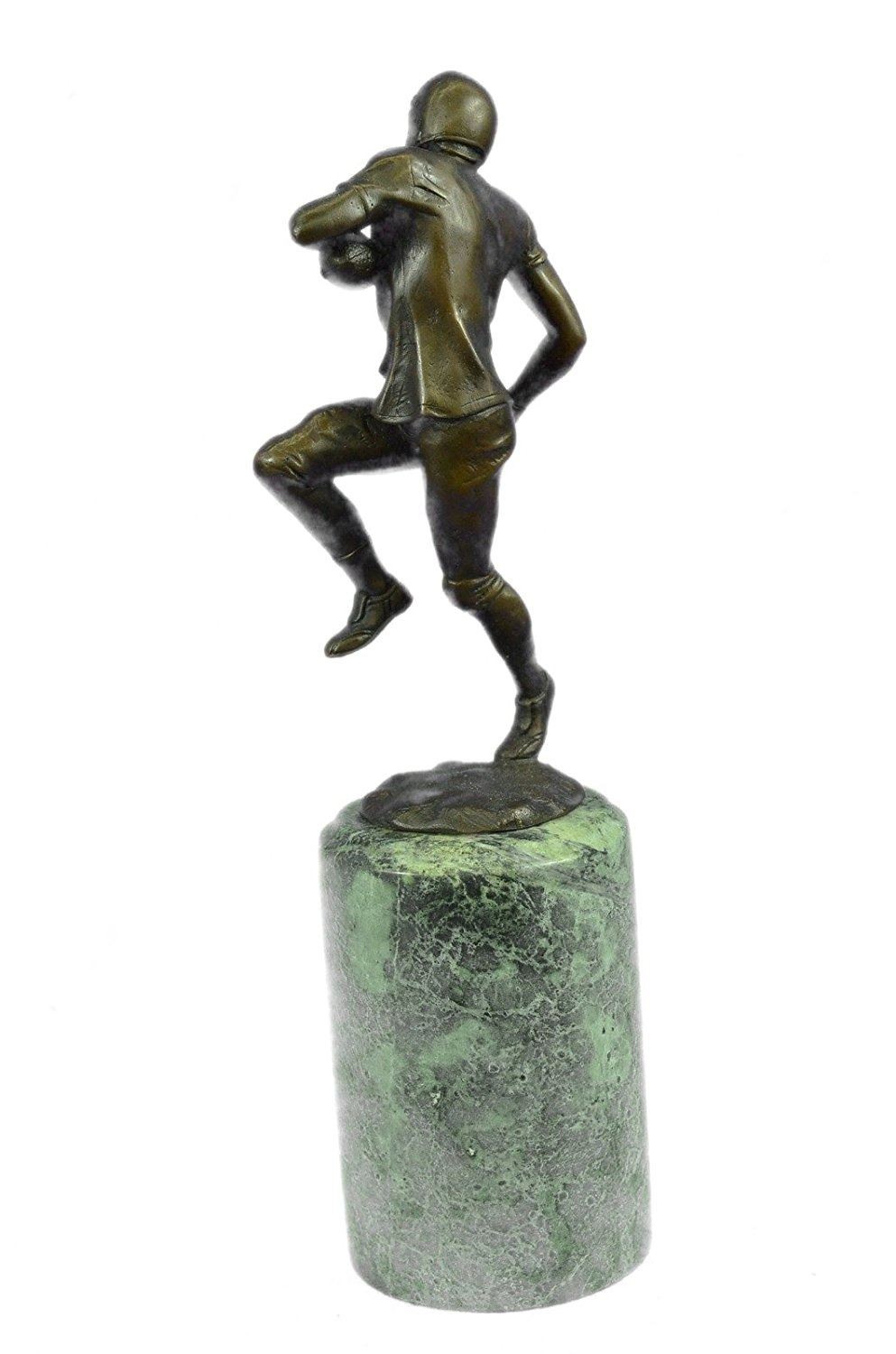 A muscular football player runs for the end field, trying to skip the yards and avoid being tackled. His powerful legs ache as he sprints and dodges. He tucks the ball under his arm protectively. Every once in a while he glances over his shoulder to see how close his opponents are. He eyes the white touch down line. 100% bronze and handmade, this brown patina sculpture was cast using the Lost Wax Method and mounted on a marble base. Bronze Dimensions with Marble Base: Height 12 X Width 4 inches. Marble Dimensions 4 inches. Weight: 7 LBS. Inventory: 68-B7122386