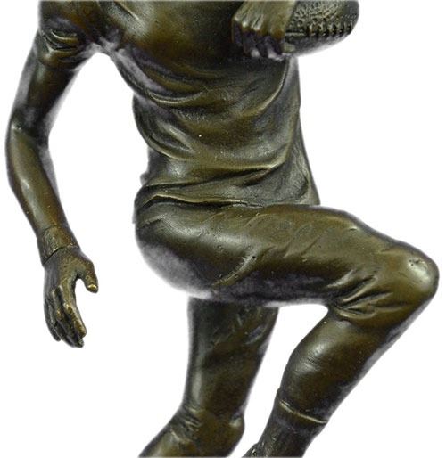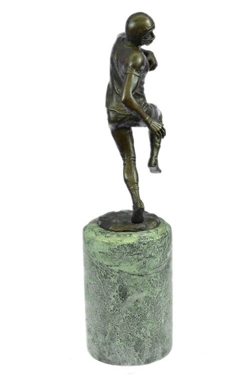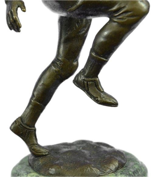 A muscular football player runs for the end field, trying to skip the yards and avoid being tackled. His powerful legs ache as he sprints and dodges. He tucks the ball under his arm protectively. Every once in a while he glances over his shoulder to see how close his opponents are. He eyes the white touch down line. 100% bronze and handmade, this brown patina sculpture was cast using the Lost Wax Method and mounted on a marble base. Bronze Dimensions with Marble Base: Height 12 X Width 4 inches. Marble Dimensions 4 inches. Weight: 7 LBS. Inventory: 68-B7122386