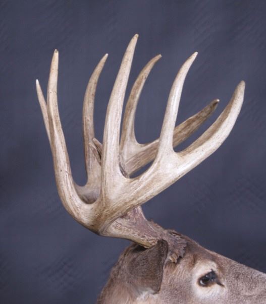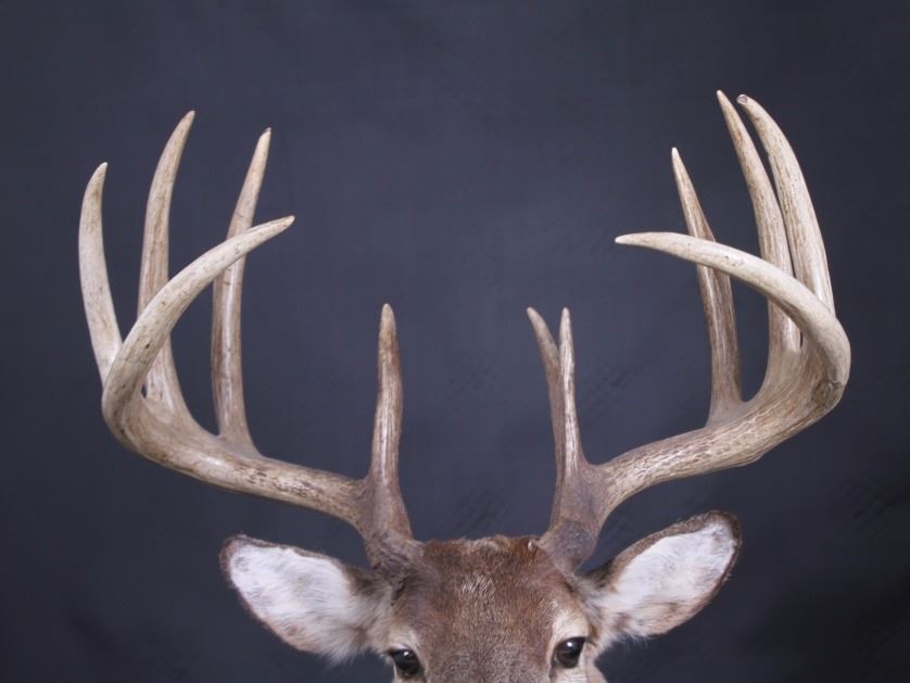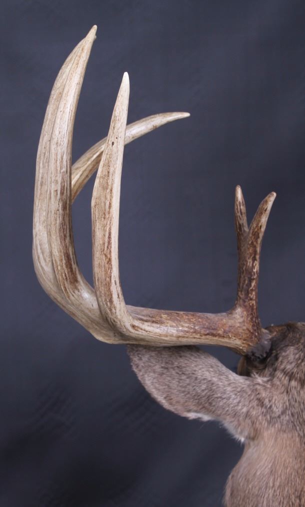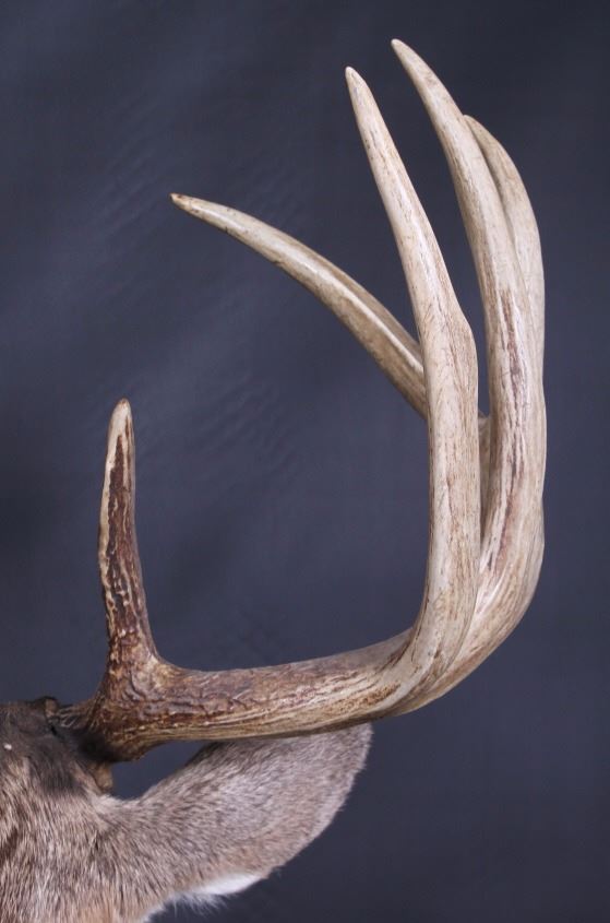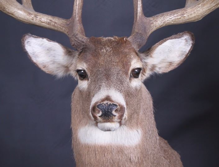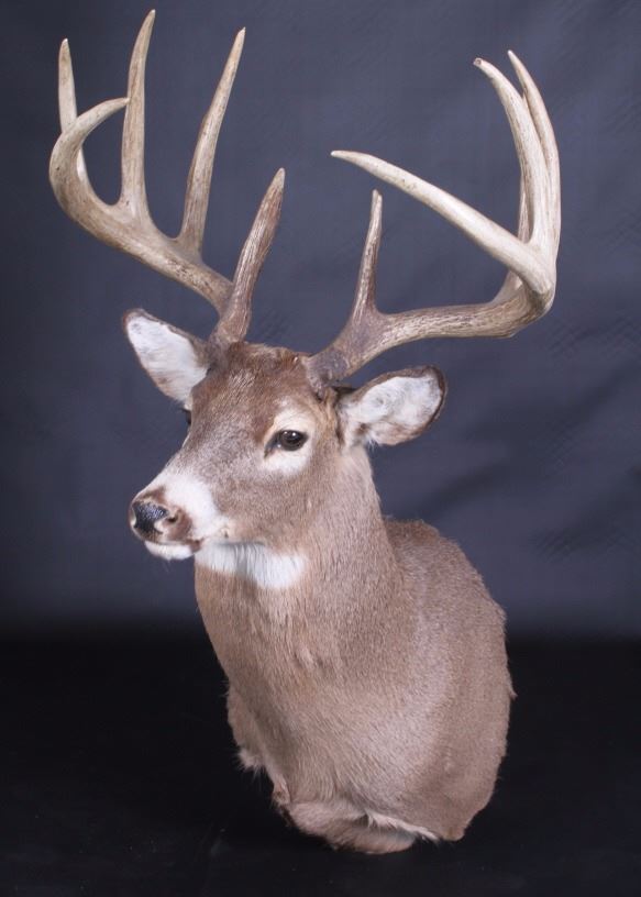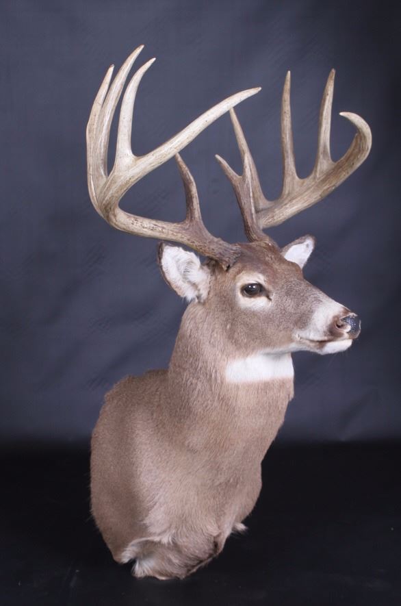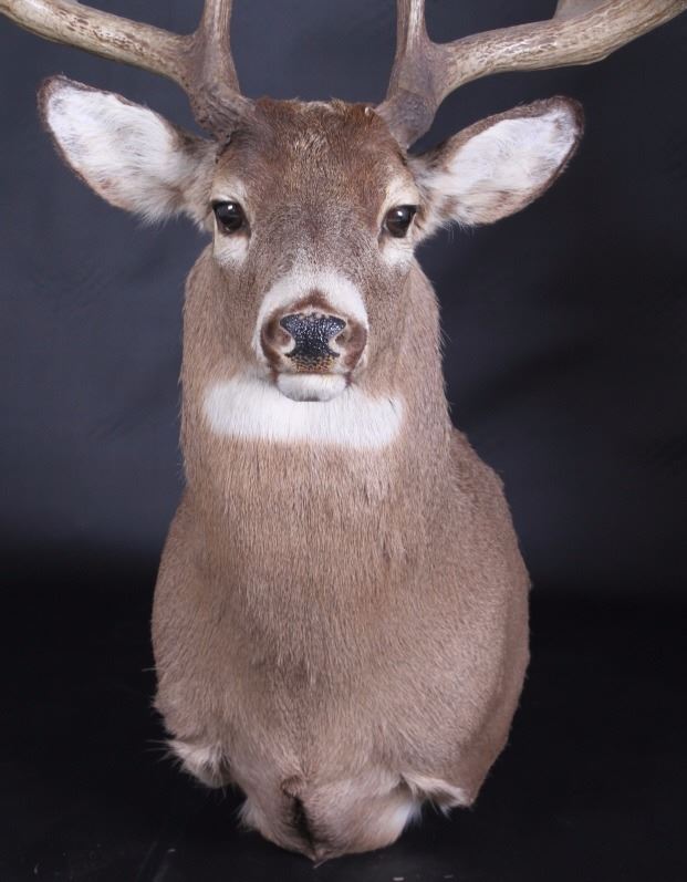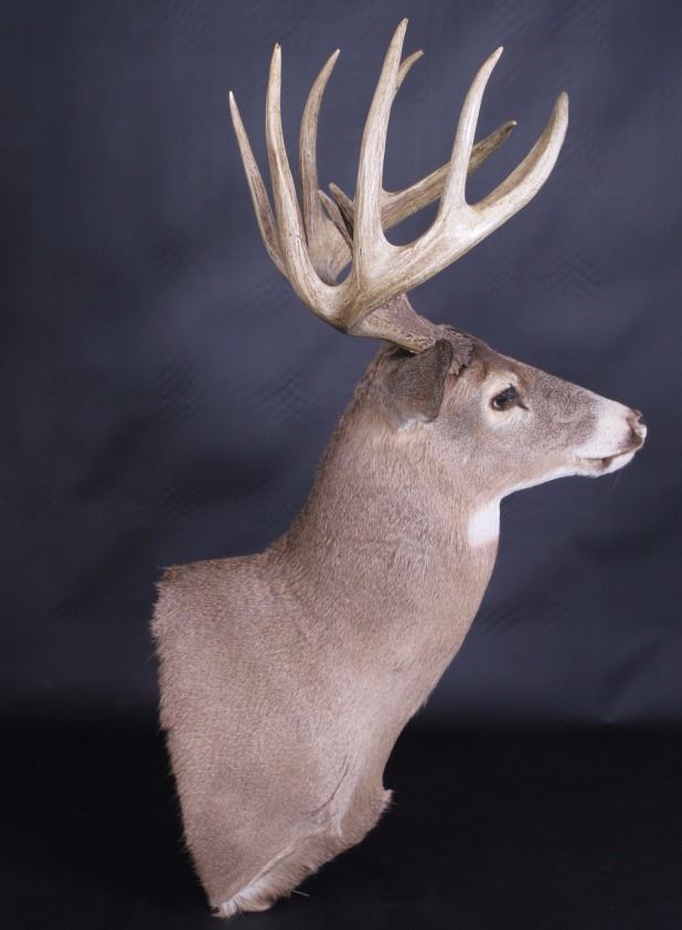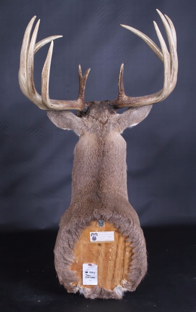 This lot features a trophy whitetail deer shoulder mount. The deer was taken in Montana. The mount displays a stunning set of antlers. The mount was professionally made by a taxidermist. The taxidermy appears to be of great quality. The mount does not appear to be experiencing shedding. The overall condition of the piece is good for its age. Measures: 44" H x 19" W x 13" D