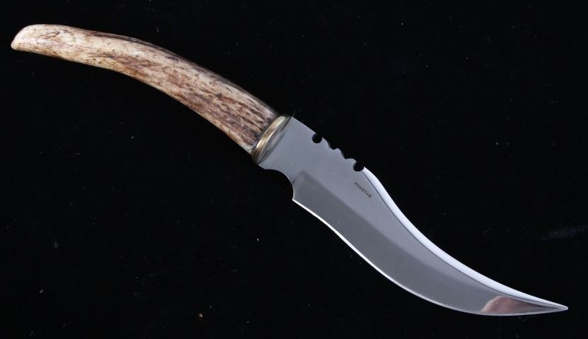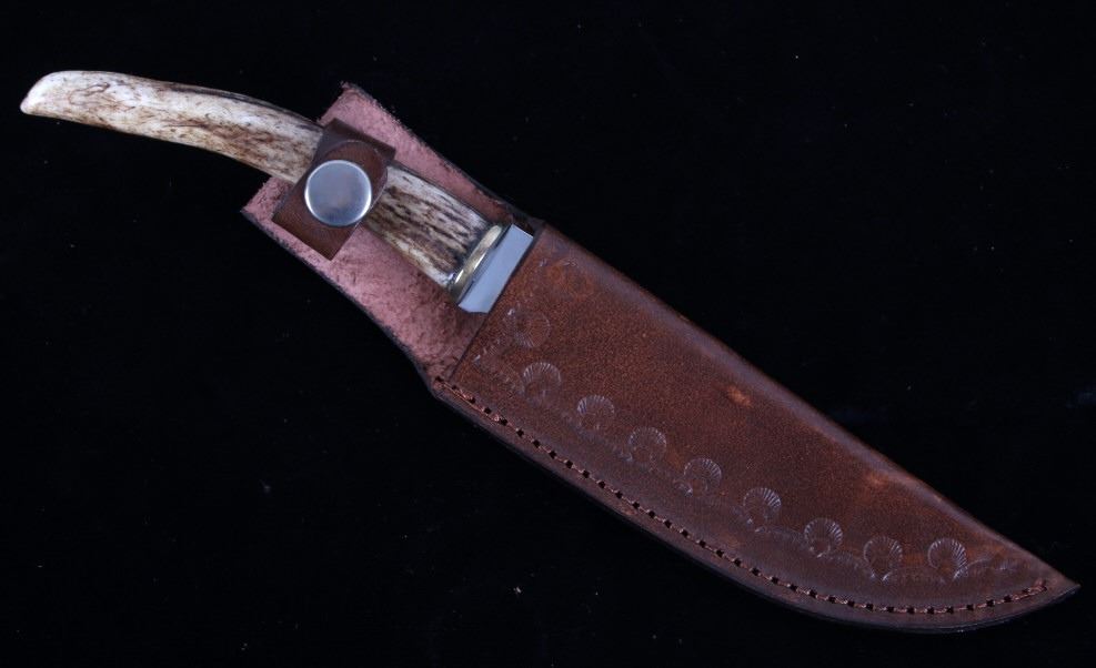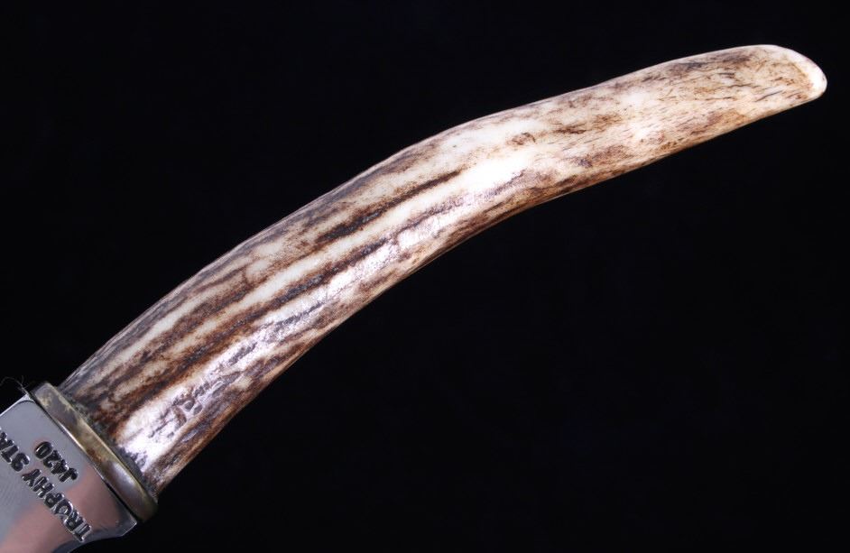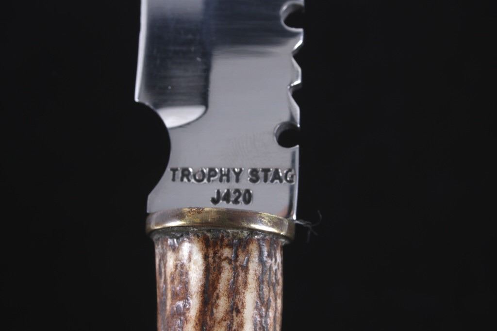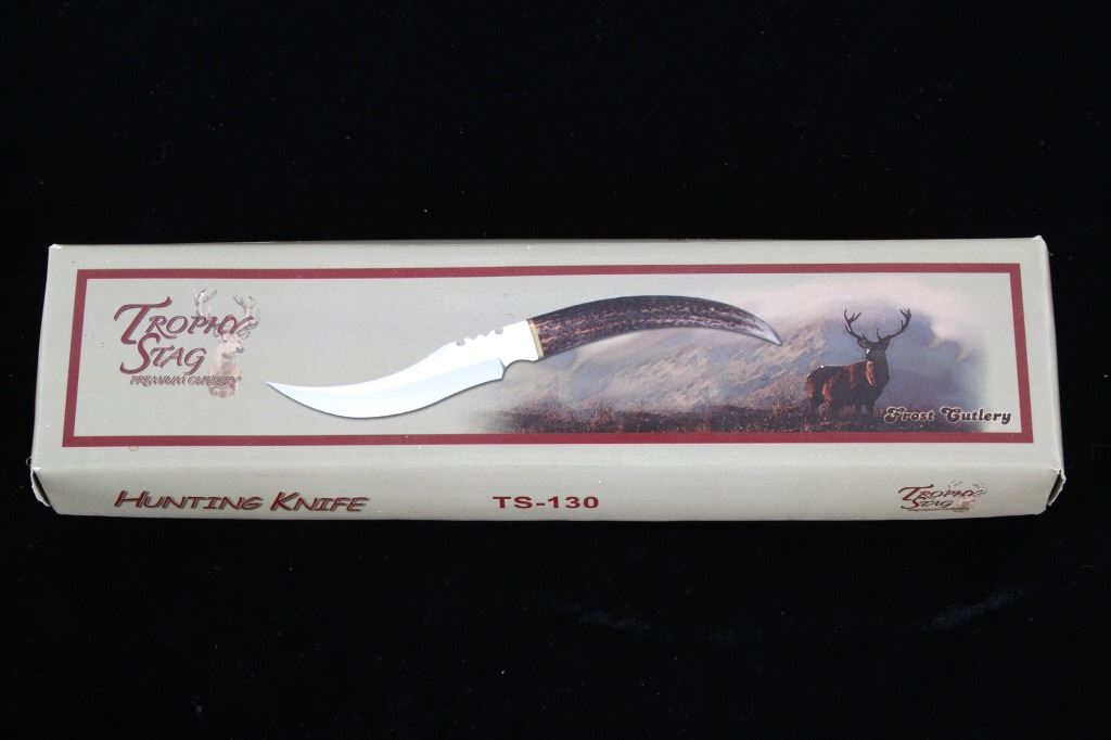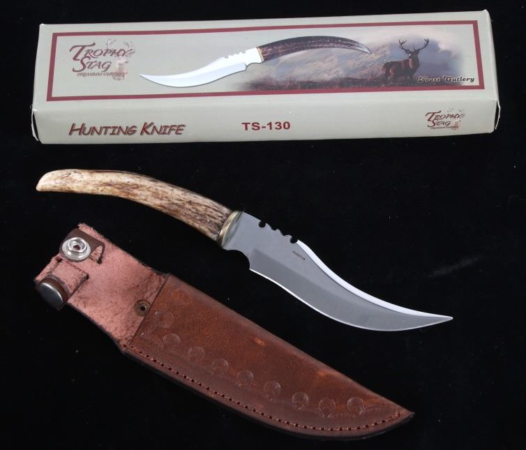 Featured in this lot is this Trophy Stag Premium Cutlery antler tine trailing point TS-130 knife. The knife features a wonderful single piece antler tine, with nice luster and polished appearance and a trailing point blade and brass hilt. The sheath is custom made to the shape of the knife style and features a stabilizing button strap. The condition of this knife is good, with no obvious signs of damage. The measurements 9 3/4" x 1 7/8" x 1 3/4" and the blade length is 4 7/8".