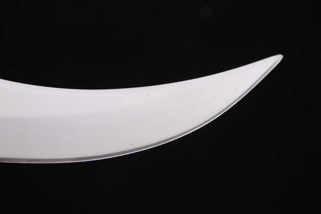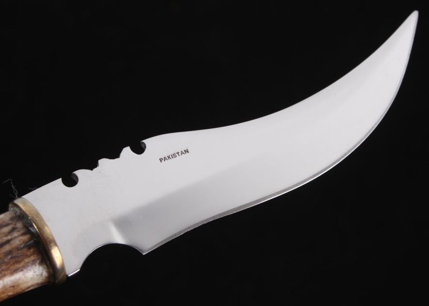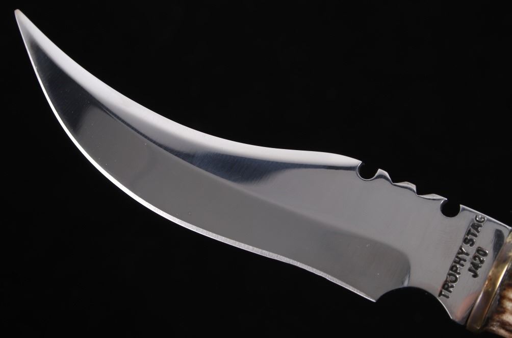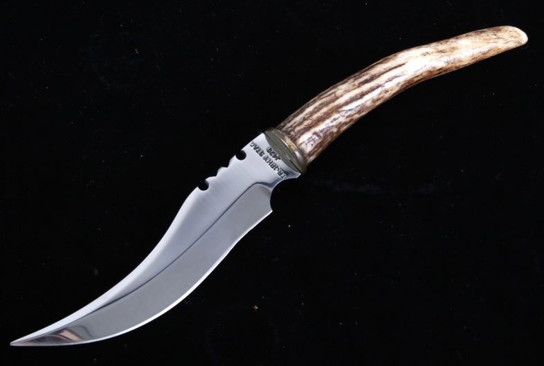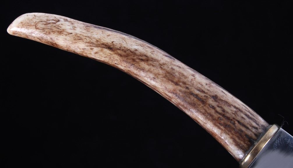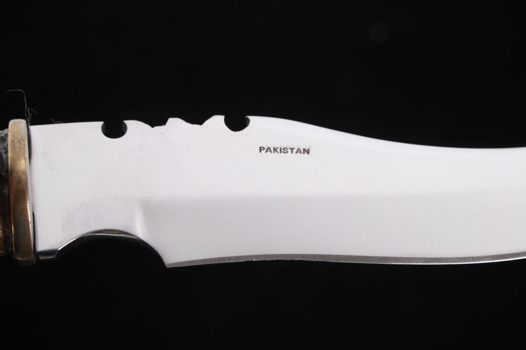 Featured in this lot is this Trophy Stag Premium Cutlery antler tine trailing point TS-130 knife. The knife features a wonderful single piece antler tine, with nice luster and polished appearance and a trailing point blade and brass hilt. The sheath is custom made to the shape of the knife style and features a stabilizing button strap. The condition of this knife is good, with no obvious signs of damage. The measurements 9 3/4" x 1 7/8" x 1 3/4" and the blade length is 4 7/8".