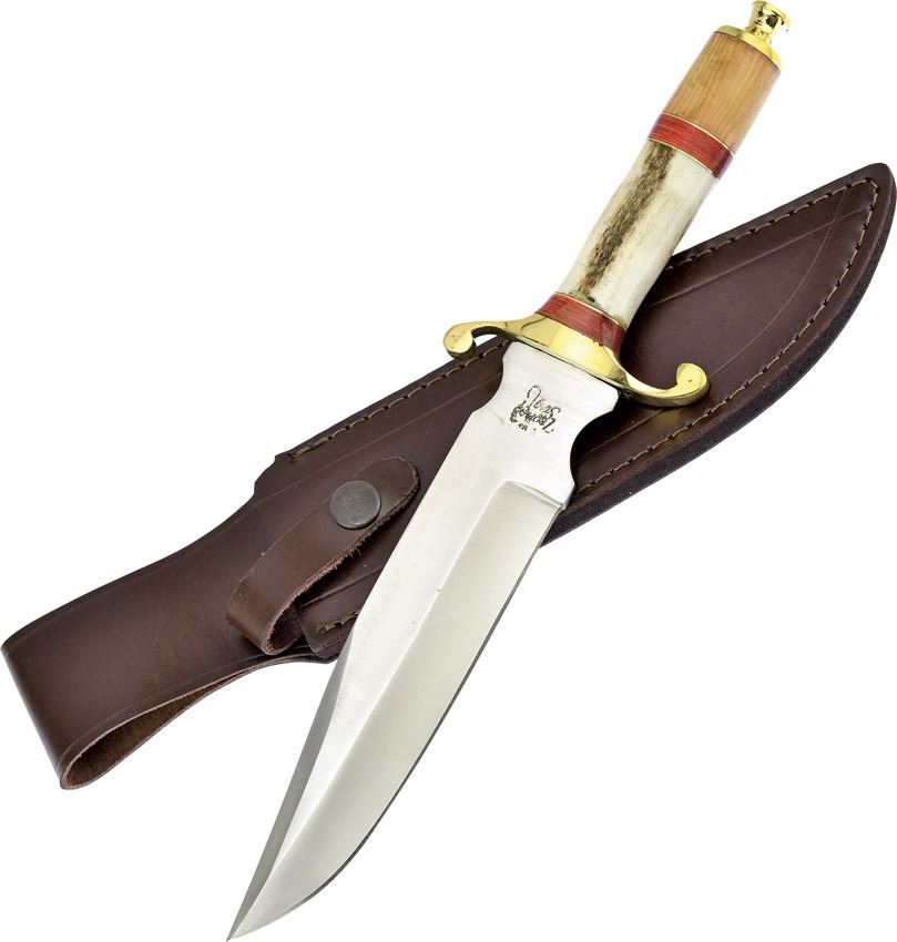 11 3/4" overall. 7 1/4" stainless blade. Polished stag and olive wood handles with red pakkawood and brass spacers. Brass guard and pommel