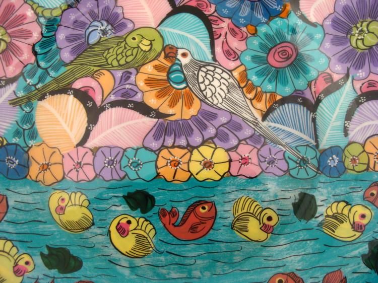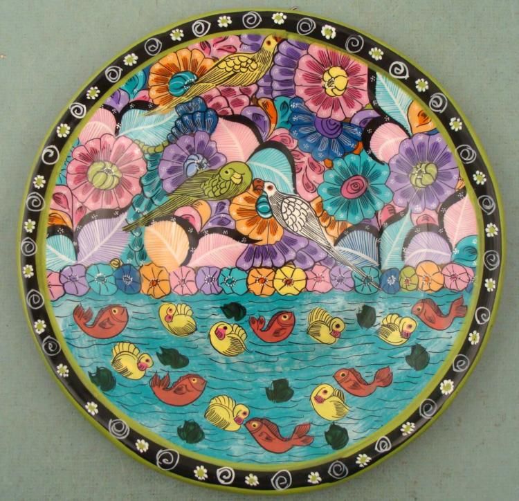 This 10" round plate has tropical birds, flowers and fish, creating an imaginative scene of nature. The back side is unglazed, and unmarked, and has a hook. Its condition is excellent. We believe this bowl is from Mexico, Costa Rica, or in that region. * It is sure to please, with it enjoyable hand-painted design.