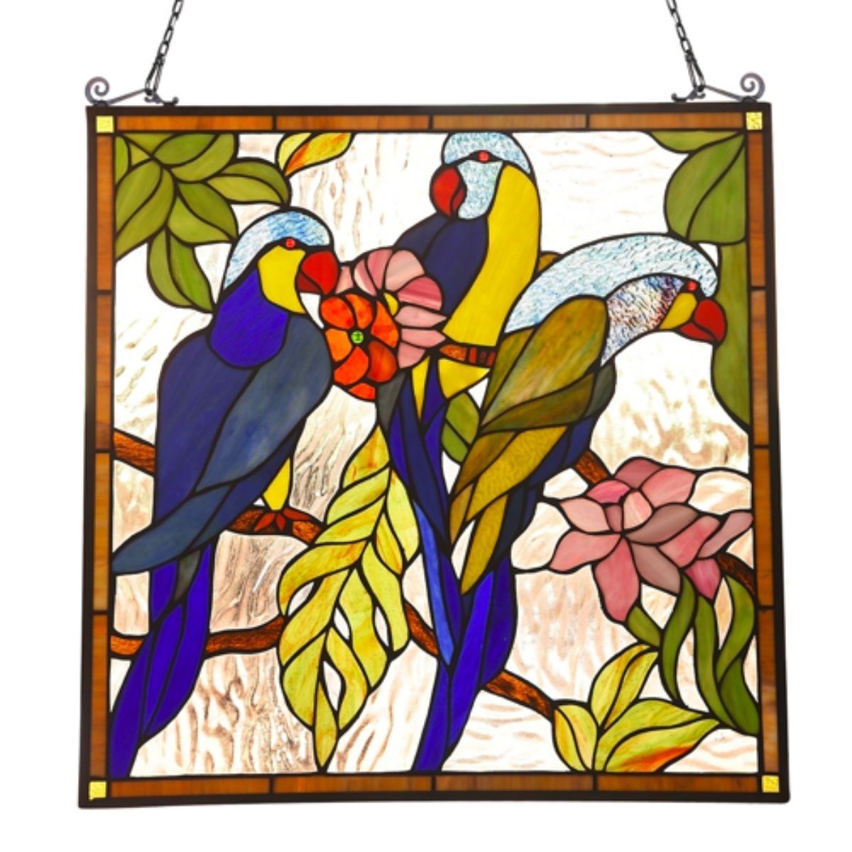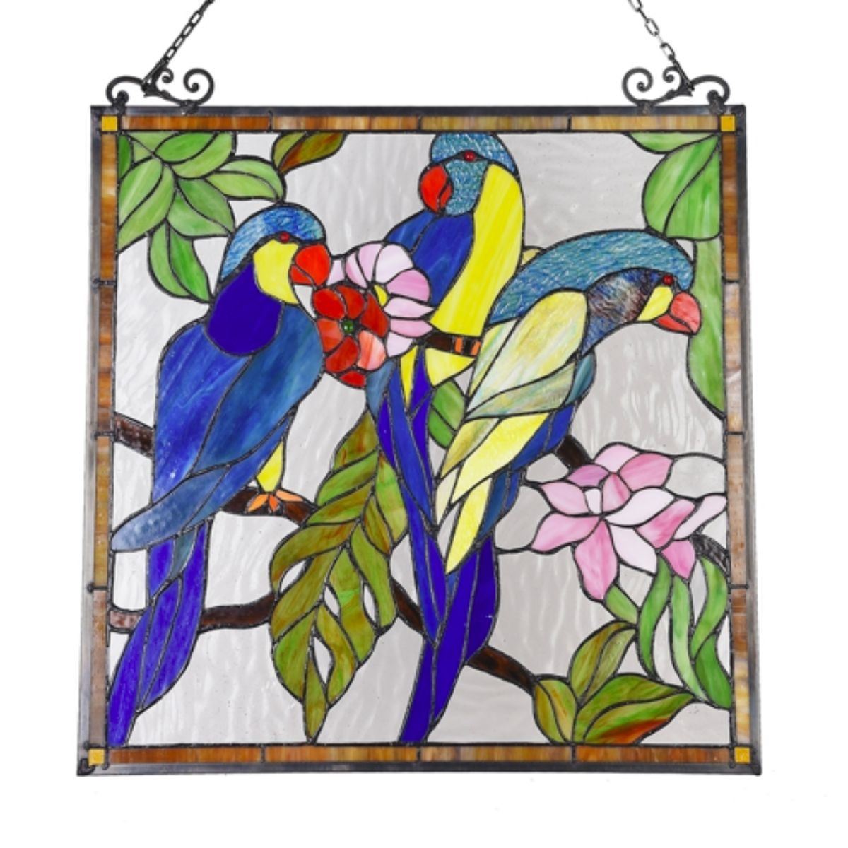 Tropical parrot birds stained art glass hanging window panel, created using 200 pieces of stained art glass & glass beads, wrapped in copper foil. 23 1/2" W X 25" H. Comes with hanging chain.Â