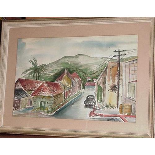 A framed watercolor, 37" X 26 1/2", scene of village street with mountains in the background, one lone car parked on the street and a single palm tree over the buildings. Signed Fisher 57 lower right. (11)
