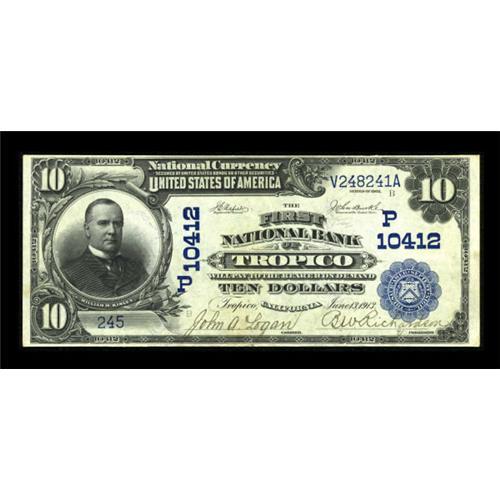 <B>Tropico, CA</B></I> - $10 1902 Date Back Fr. 622 <B>The First NB</B></I> Ch. # (P)10412<BR> This extremely rare bank issued under three different titles in two locations, with Tropico being the first. Five large and one small note make up the entire census, with three notes extant from Tropico and one large note each from the two successor titles in Glendale. All except this example were present in the Colver collection, with the two Tropico notes each selling for $9350 back in 1999. The lower grade piece of the pair was reoffered as part of the Horwedel collection, which we sold in 2004, realizing $10,350 at that sale. The note offered here is the nicest of all, grading a solid <B>Extremely Fine</B></I> and boasting great color, sharp pen signatures, and wonderful overall eye appeal. Expect this rare Los Angeles County example to certainly reach and perhaps well exceed the five figure mark. <BR><I>From The Kansas City Collection.</B></I><BR><BR><b>Shipping:</b> Coins & Currency (<a target="_blank" href="http://www.heritageauctions.com/common/shipping.php">view shipping information</a>)