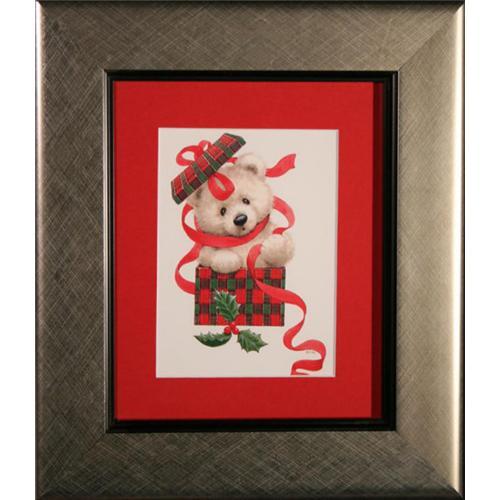 This cozy print is artfully tasteful in its depiction of a cuddly teddy bear popping out from a Christmas gift box. Just in time for the holiday season, this print portrays the red and green color scheme associated with the jolly Christmas season. The green and red plaid box is further enhanced by seasonal mistletoe and a flowing red ribbon. The artist rendered the teddy bear to be as sweet as can be with innocently pleading eyes looking playfully at the viewer. The softness of the bear is enhanced by the artist?s use of soft lines and strokes. At 12.25? x 14.25? in a single Christmas red mat with a silver/gold and black interior frame, this print would make the perfect holiday gift or showpiece for art Christmas lovers alike.