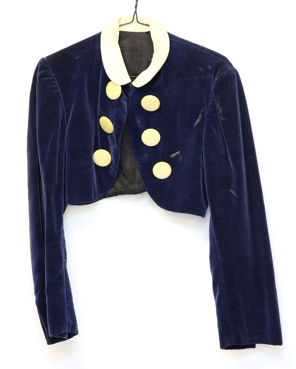 Trouble for Two (1936) - David Holt production made velvet textured jacket in navy blue with six large ivory coloured buttons and a cream collar. Inscribed Western Costume Co label, stamp and other ink inscriptions within.