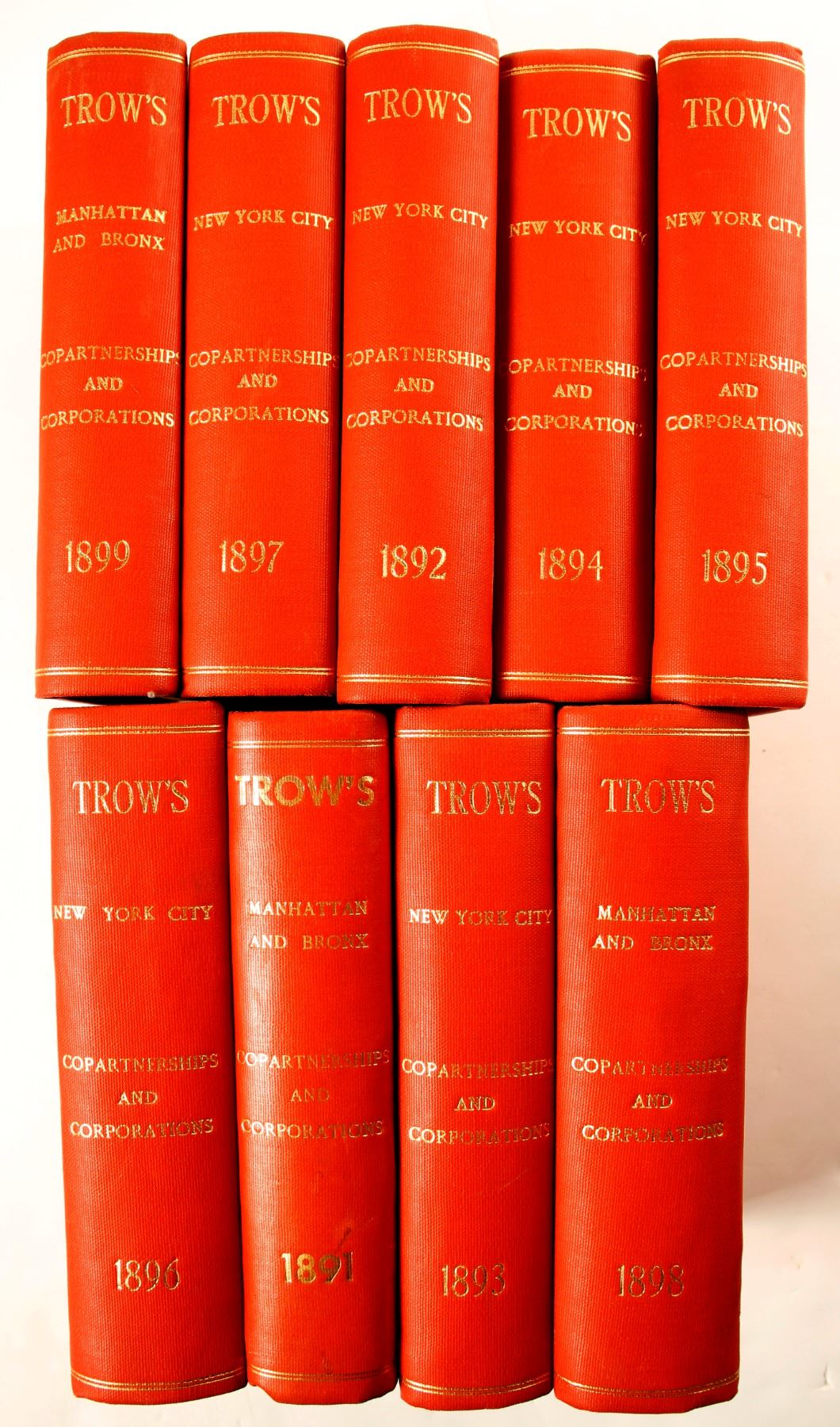 Nine volumes of Trow's Co-partnership and Corporation directories for 1891-1899 complete. Orange binding, fine. Choice business reference for the 1890's recession and for info from a period where many Federal records are lost (census).