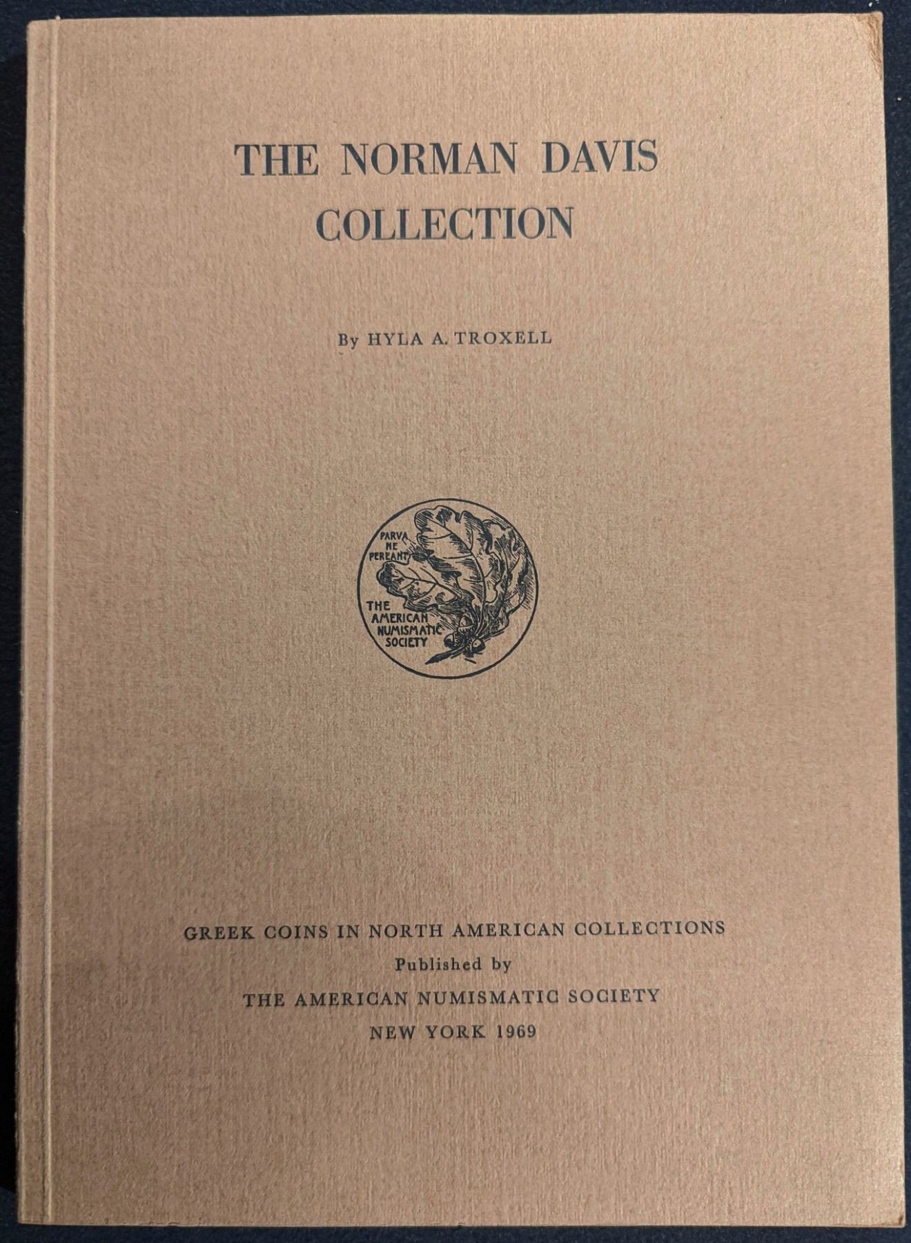 Troxell, Hyla A. THE NORMAN DAVIS COLLECTION. The American Numismatic Society. 1969. 4to. (4), 53, (3) pages. New York. original brown printed card covers. 28 fine plates of coins. Fine. The first installment in the American Numismatic Society's Ancient Coins in North American Collections series. Assembled over the past two decades, the Norman Davis Collection comprises examples of the major coinages of the Greek world. It is noteworthy not only for the consistently high standard of style and condition but also for special series and individual rarities. The Seleucid and Indo-Greek sequences are particularly impressive, and any museum would be proud to possess unique specimens like the stater of Melos (no. r8r), the tetradrachm of Heliocles of Bactria (no. 307) and the tetradrachm of Ptolemy IV (no. 332). Many of the coins have been illustrated in enlargement in Mr. Davis' recent book, Greek Coins and Cities; approximately one hundred of them are on permanent display at the Seattle Art Museum. The publication conforms to the general format of the Sylloge Nummorum Graecorum fascicules in placing emphasis on the reproduction of the coins and limiting the text to basic numismatic data. References and dates are given only when there has been a thorough mint study of a particular coinage. Earlier publications of individual coins have been noted in some cases but no comprehensive search of sale catalogues has been undertaken. All weights are in grams and all coins are silver unless otherwise indicated. The American Numismatic Society presents the Norman Davis Collection as the first in a projected series of publications, recording material of numismatic value which is not readily accessible or perhaps even known to exist. It is hoped that other private collectors and institutions will follow Mr. Davis' example in making their holdings available to the scholar. Important. Lot weight: 0 lbs 13oz. Subject(s): Ancient Coinage.