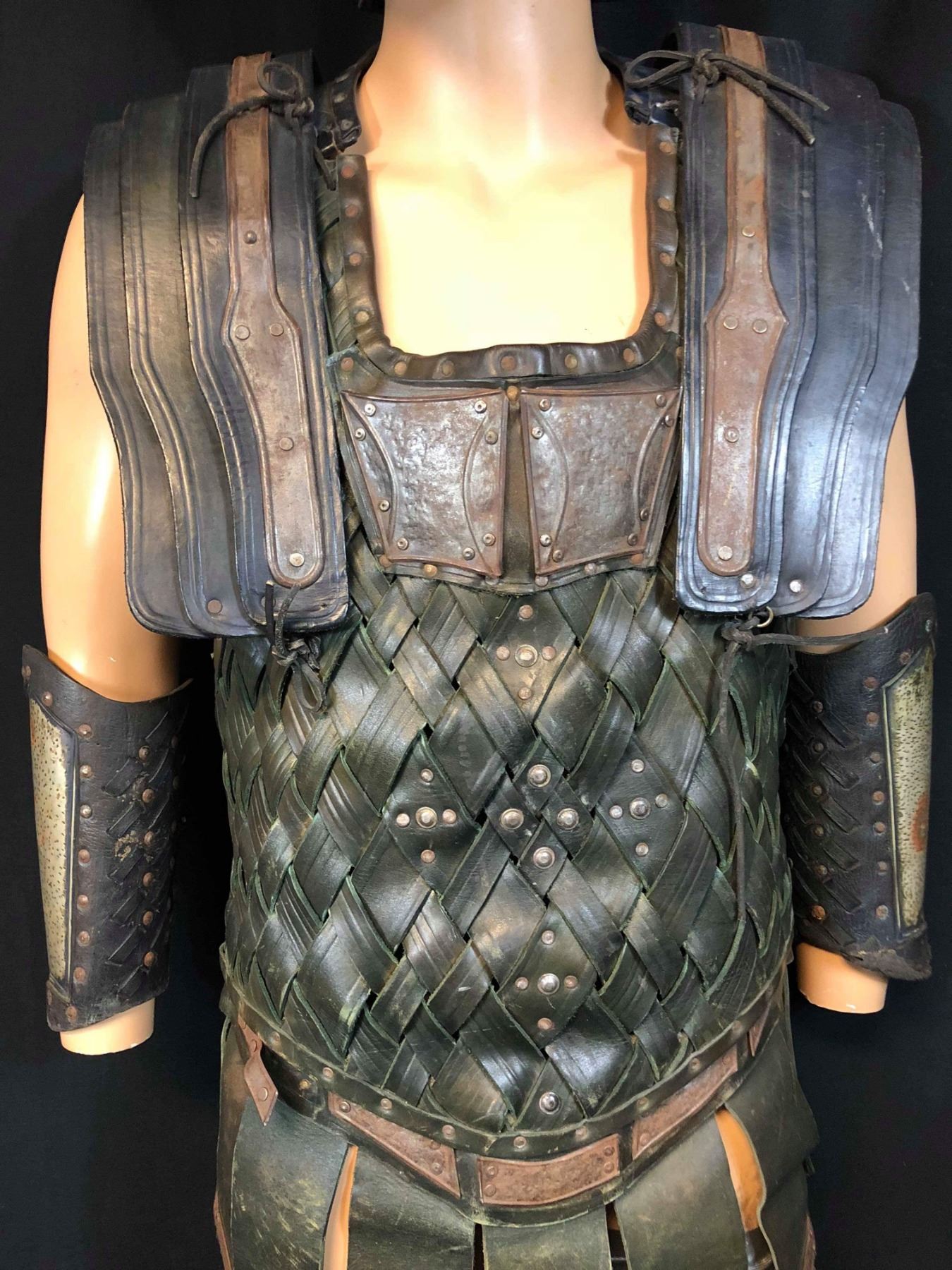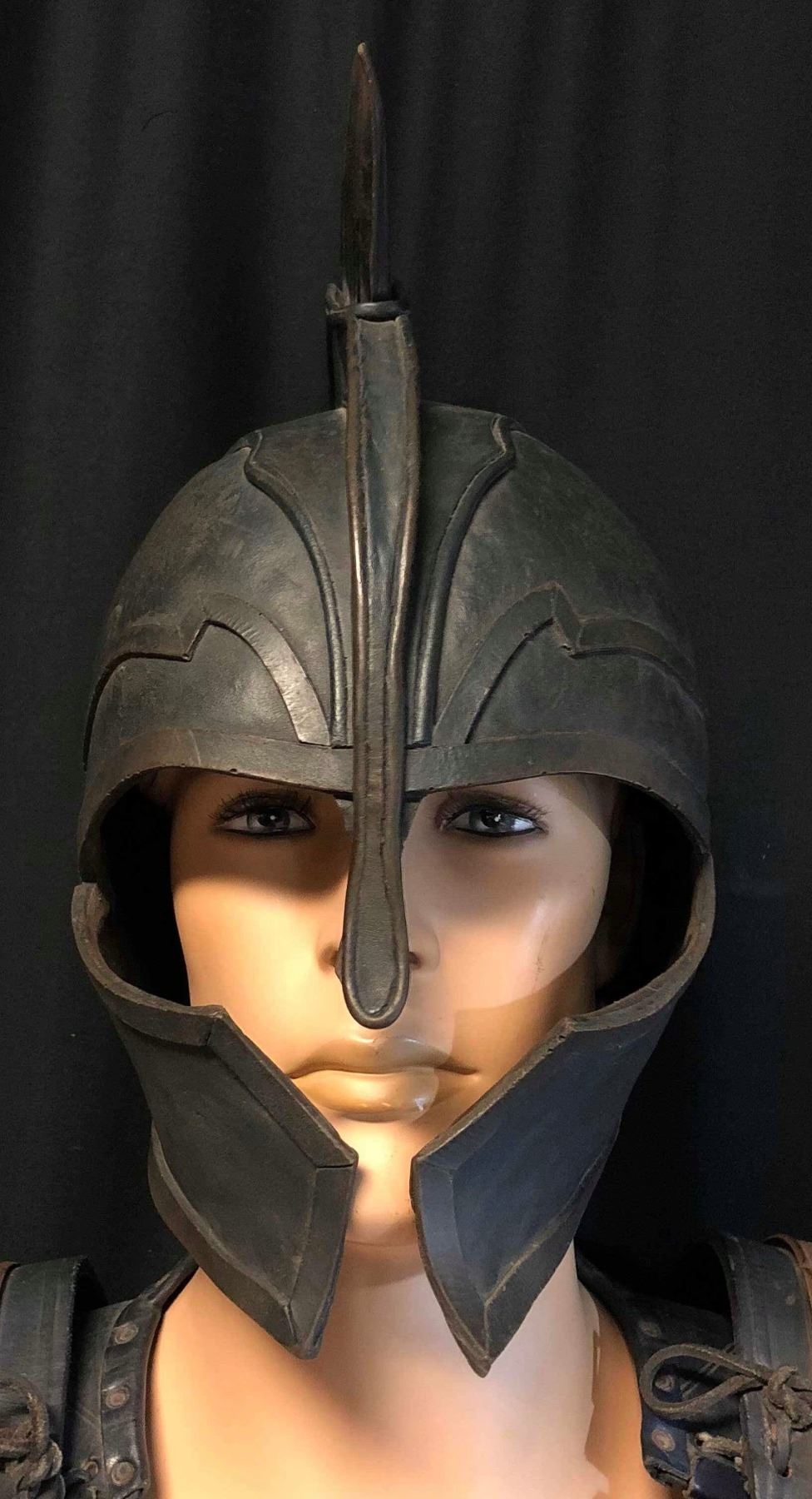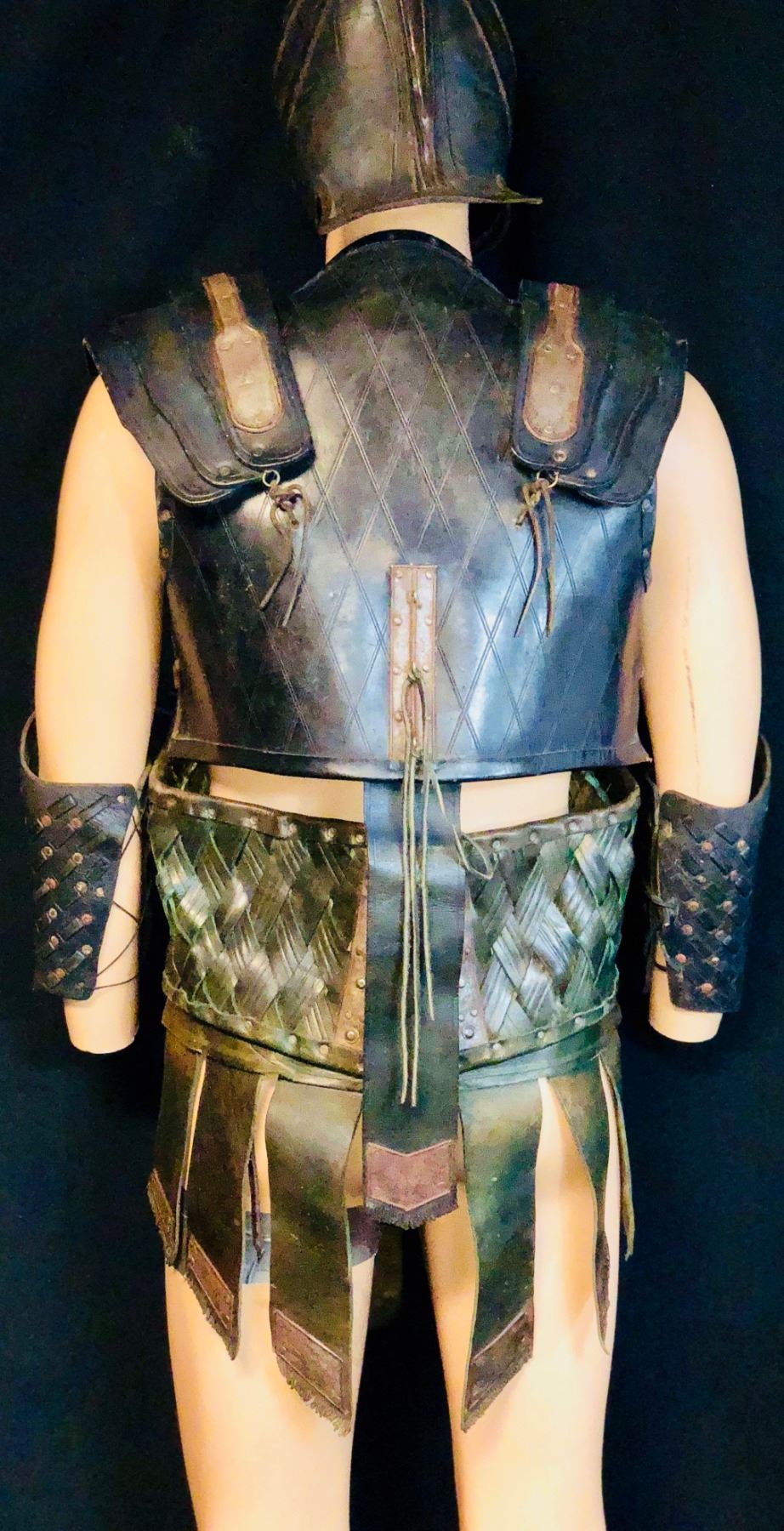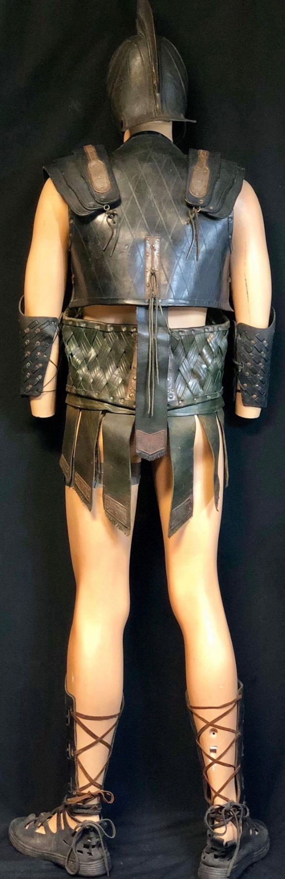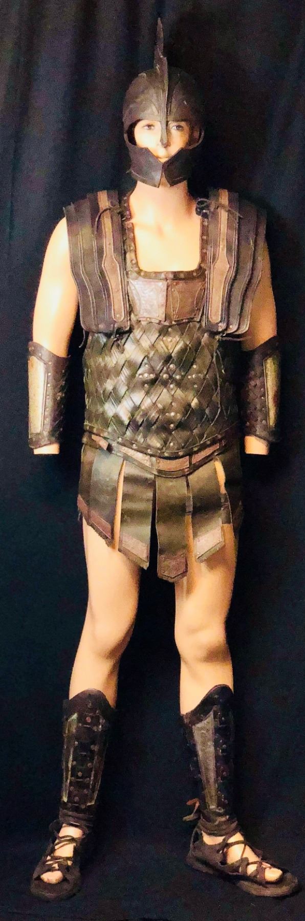 The costume consists of a set of chest armor with shoulder pieces, a rubber helmet with the fin still intact on top, pair of leather and metal arm pieces, a set of greaves, leather skirt with leather ties, and a pair of lether sandles.