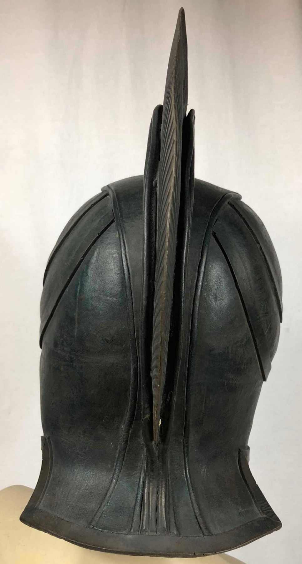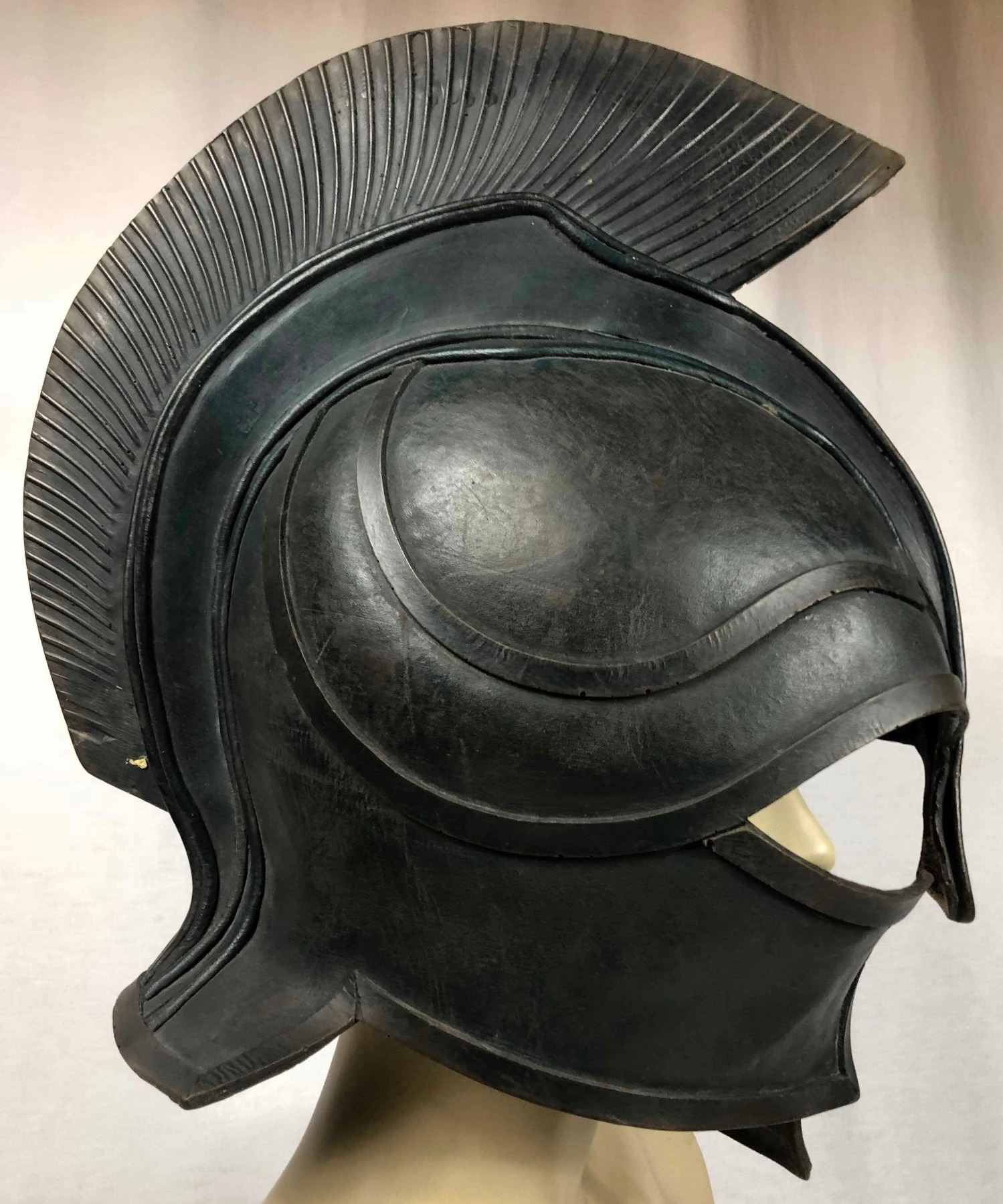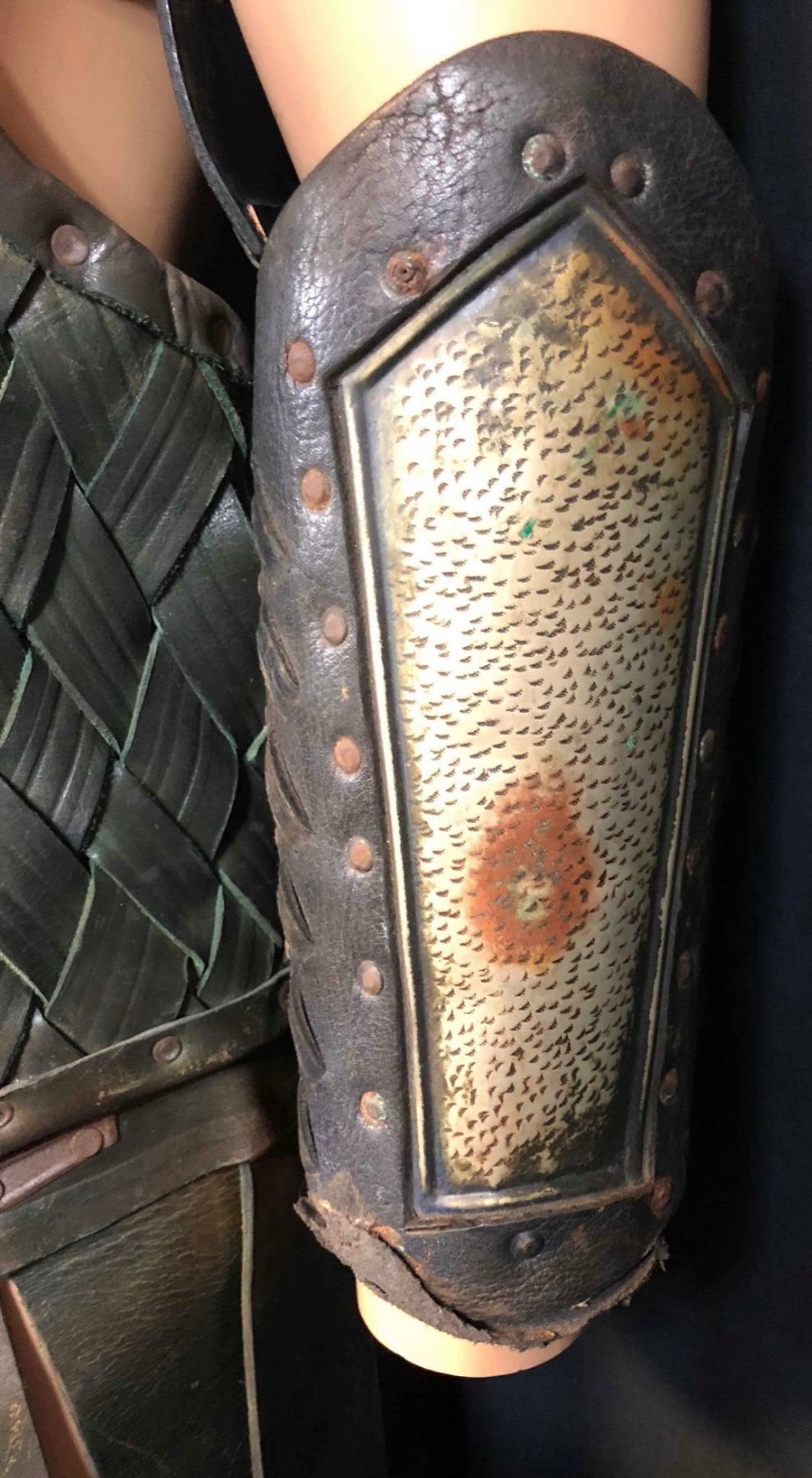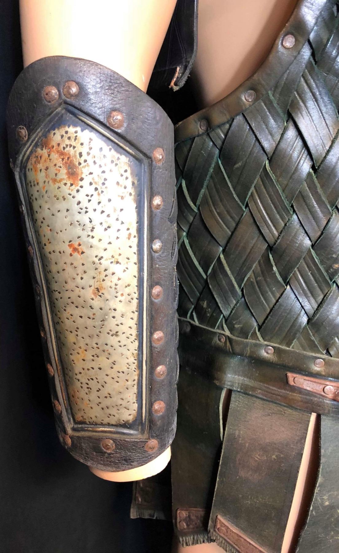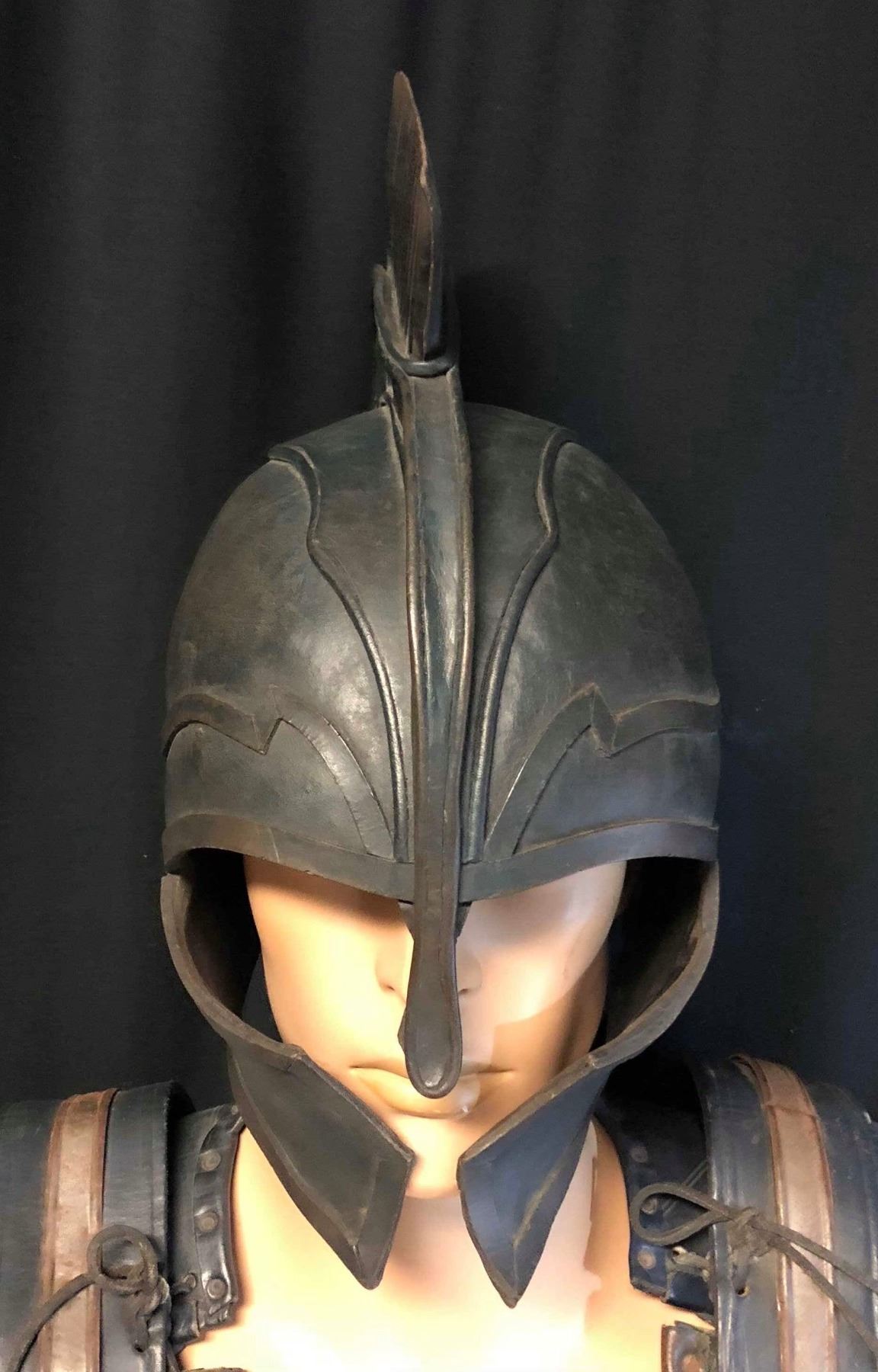 The costume consists of a set of chest armor with shoulder pieces, a rubber helmet with the fin still intact on top, pair of leather and metal arm pieces, a set of greaves, leather skirt with leather ties, and a pair of lether sandles.